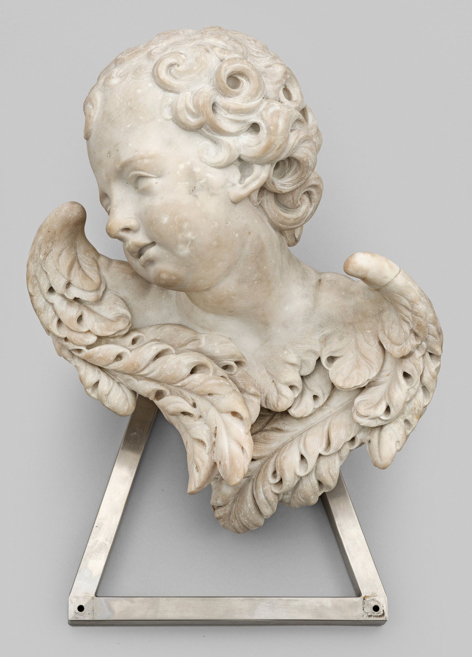 Marmor, vollplastisch gearbeitet. Geflügelter Kopf eines zur Seite blickenden, kindlichen Engels mit leicht geöffnetem Mund. Wandmontierung erg.; Rest.; 40 cm x 35 cm.