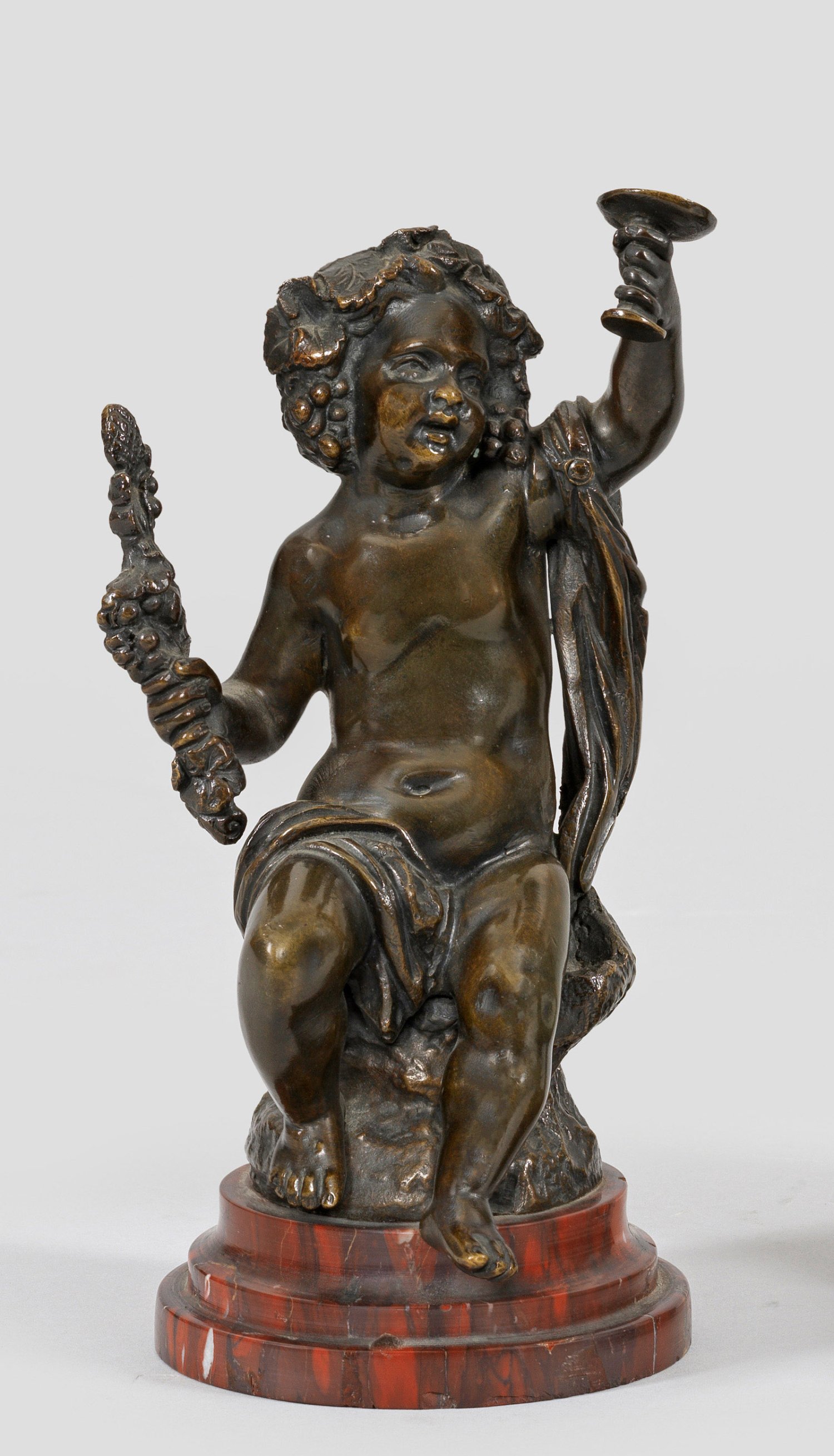 Bronze, braun patiniert. Bez.; Dunkelroter Marmorsockel. Französischer Guss, 19. Jh.; Der bedeutende französische Bildhauer war ein Schüler von Jean-Batiste Pigalle und arbeitete unter dem Pseudonym Clodion. Hauptsujet des für den Hof König Ludwig XVI. und für vermögende Privatsammler arbeitenden Künstlers, waren mythologische Motive, Faune, Nymphen, Satyrn, Putten und grazile Mädchen. Ges.-H. 19,7 cm.