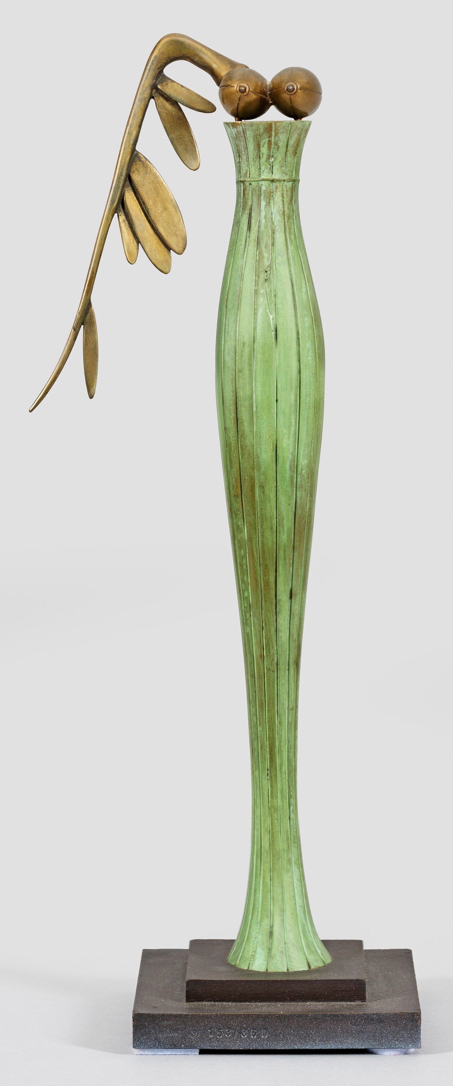 Bronze, polychrom patiniert. Signatur-Stempel, nummeriert 153/360. Gießerstempel von ARA Kunst Dr. Fritz Albrecht, Altrandsberg. Abstrakte, um 2004 entstandene Darstellung der Siegesgöttin, auf rechteckig gestuftem Sockel stehend. H. 41 cm.