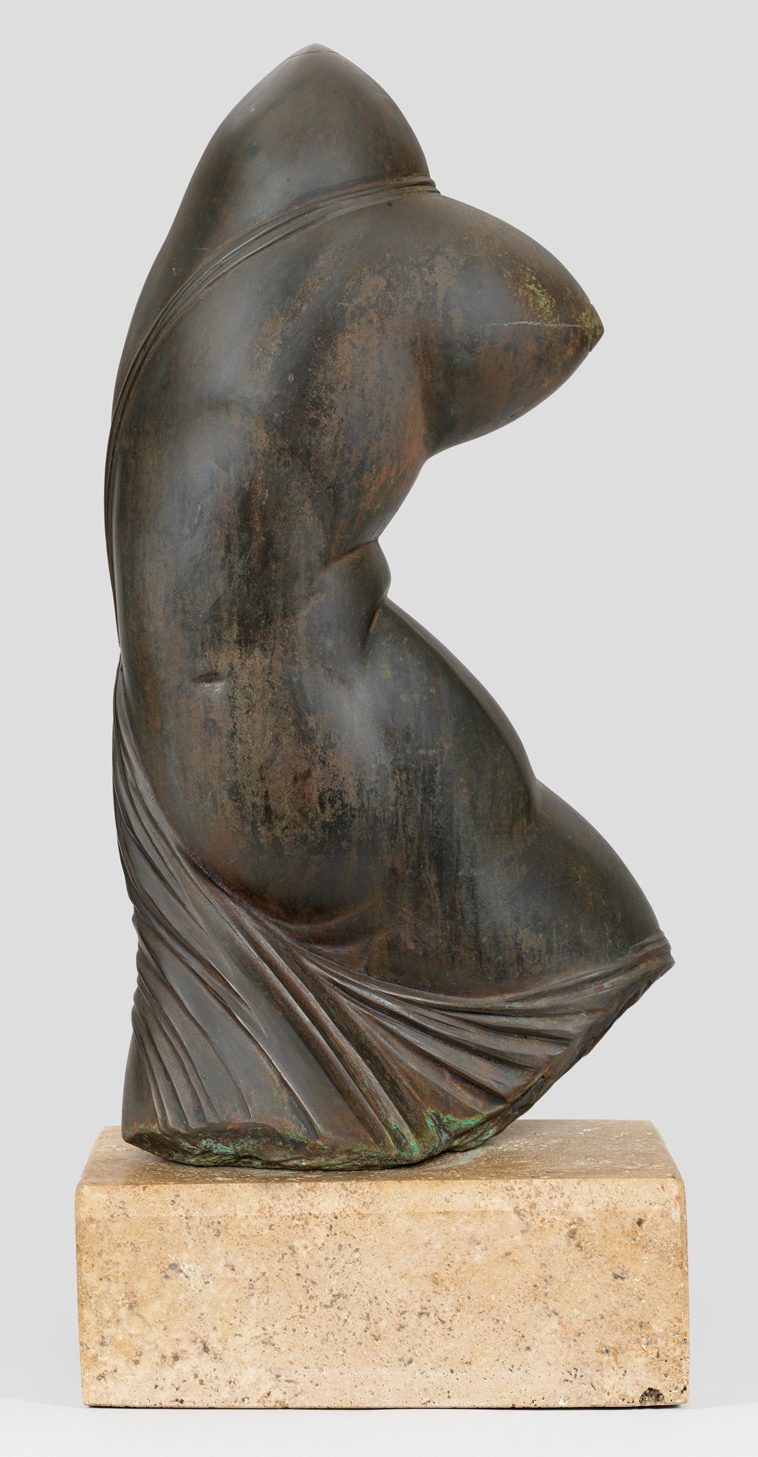 Bronze, dunkel patiniert, 1998. Monogr. und dat. (19)98. Nummeriert 1/5. Gießereistempel "Ihle & Janus Dresden". Auf Steinsockel. In kubistischer Weise stilisierter Torso mit polierter Oberfläche, komponiert aus volumenhaft gerundeten, weiblichen Formelementen. Torsi und Akte sowie fragmentierte weibliche Formen sind Hauptmotive im Oeuvre des Bildhauers. Der ausgebildete Steinmetz- und Steinbildhauer gehörte der nonkonformen Dresdner-Künstlergruppe "Erste Phalanx Nedserd" an, zu der u.a. A. R. Penck zählte. Bronze-H. 60 cm. Ges.-H. 71 cm.