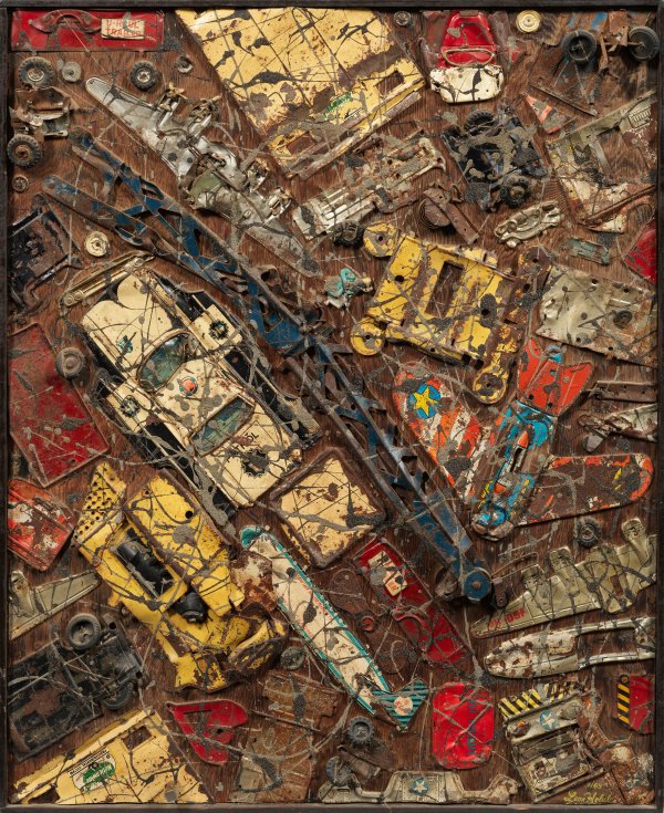 Assemblage aus diversen zerlegten Blechspielzeugen und Zubehör, sorgfältig arrangiert auf einer Platte mit anschließender "dripping" Übermalung, deren spontane, zufällige Komponente einen reizvollen Kontrast zur akkurat anmutenden Komposition der montierten Bildobjekte darstellt. Der um 1950-1970 in New York tätige Künstler Leon Holub schuf im Auftrag der Virginia Frankel Gallery u. a. Mosaikplatten aus Treibholzsplittern für die Vorstandsetage der Prudential Steamship Line. Mixed Media Collage mit Übermalung/Holzplatte. R. u. sign. und dat. 7/(19)65. Verso Atelieradresse. 74,5 cm x 61 cm. Rahmen.