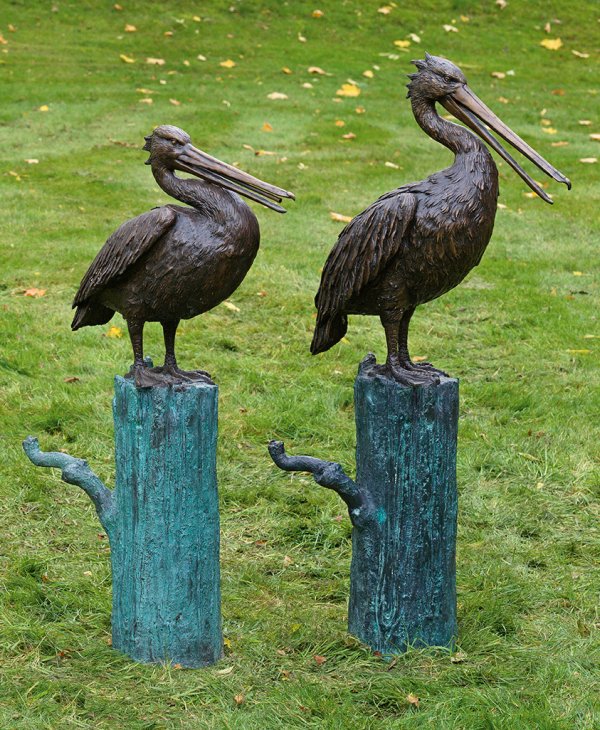 Contemporary animal sculptor active 20th/21st century. A pair of brown and green patinated bronze garden sculptures of pelicans sitting on posts.