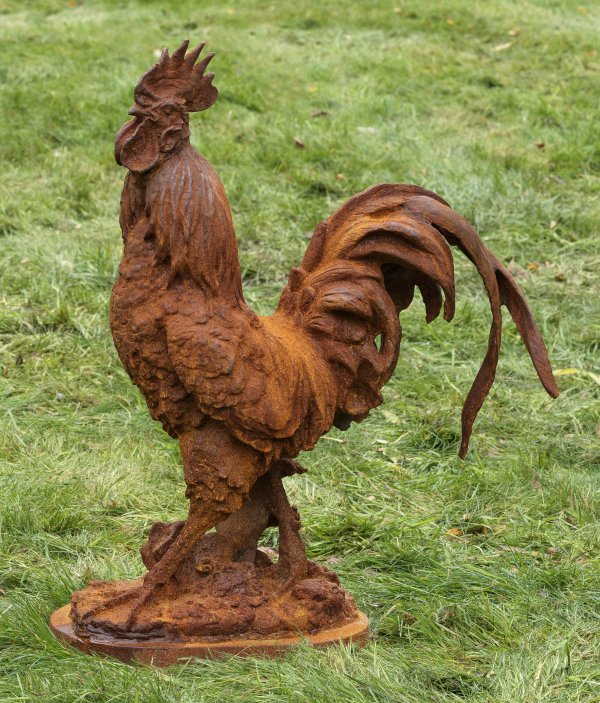 Eisenguss mit Rostpatina. Lebensgroße, naturalistische Darstellung eines stehenden Hahns auf ovalem Terrainsockel.. H. 65 cm.