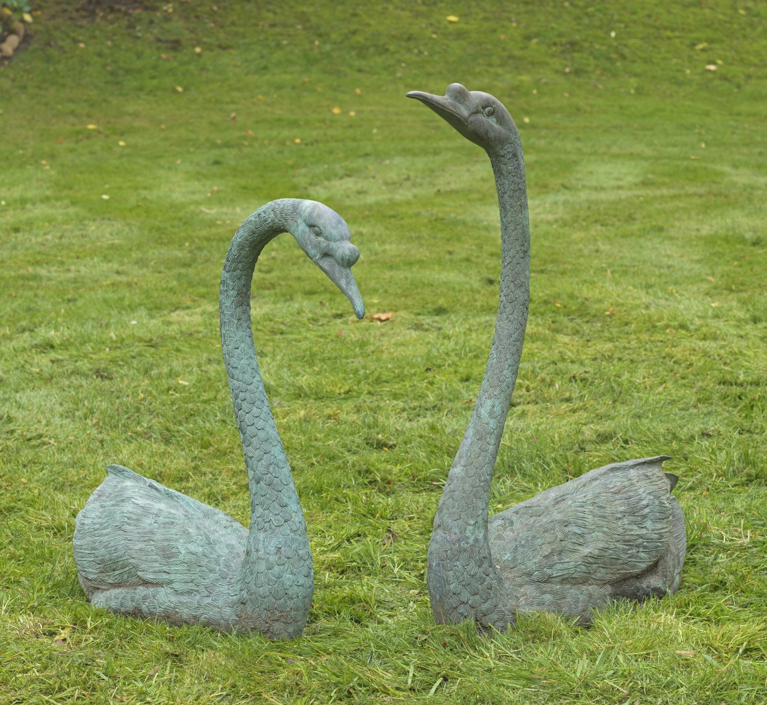 Gegenstücke. Bronze, grün patiniert. Vollplastische, annähernd lebensgroße, naturgetreue, lebendige Darstellungen zweier schwimmender Schwäne mit gesenktem bzw. hoch erhobenem Kopf. Detailreich modellierte Federzeichnung. H. ca. 72-91 cm.