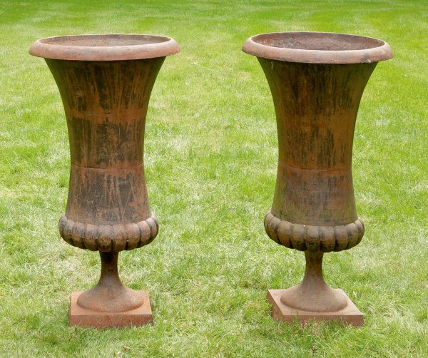 A pair of large French cast iron garden vases.