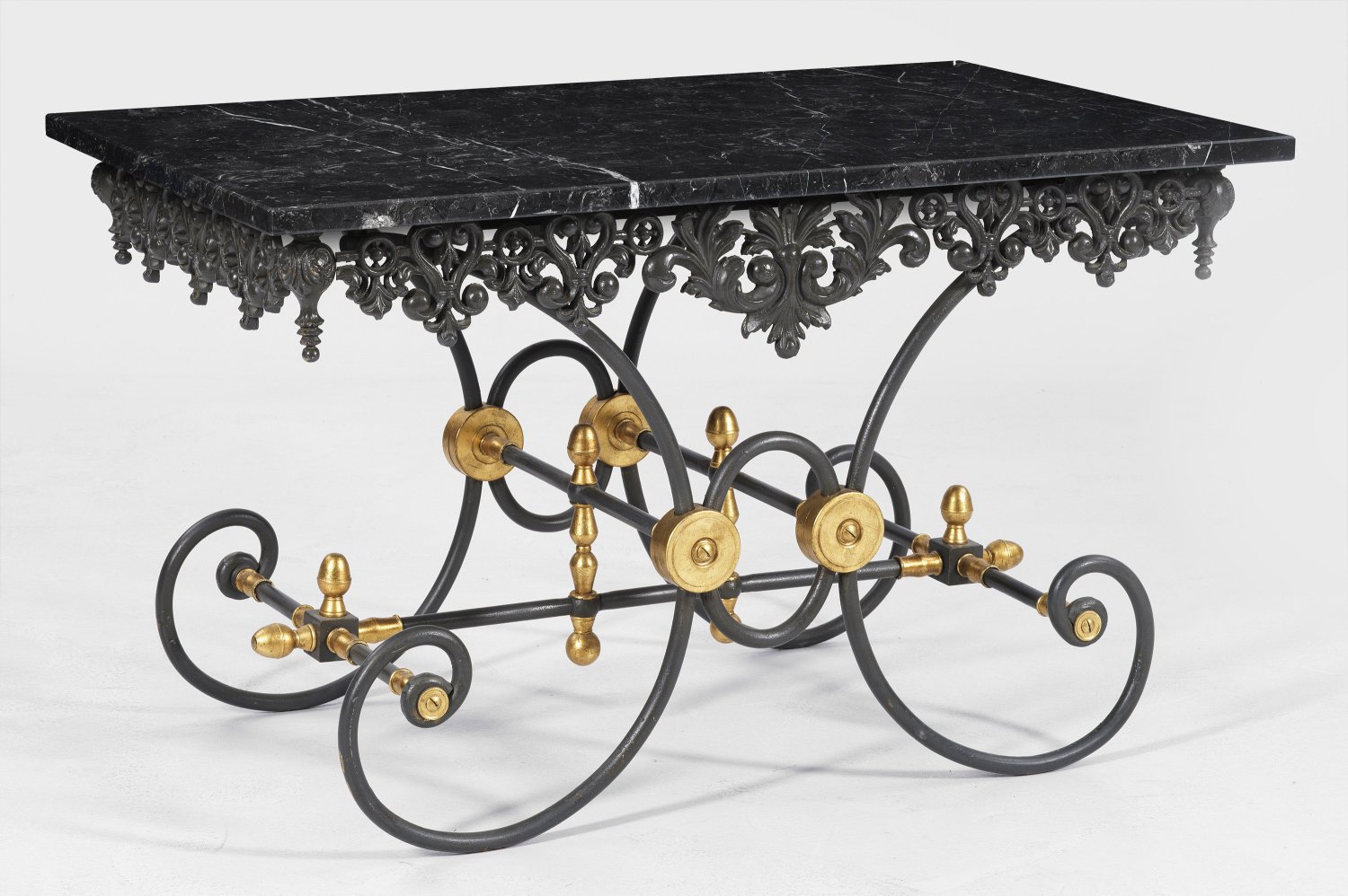 Eisen, grau gefasst und teilw. vergoldet. Durchbrochen gearbeitete Zarge aus üppigem Blattwerk auf stark geschwungenen Beinen aus gegeneinander gestellten Voluten, durch schmale Stege verbunden. Rechteckige Deckplatte aus dunkelgrauem, weiß gemasertem Marmor. H. 78 cm. 130 cm x 76 cm.