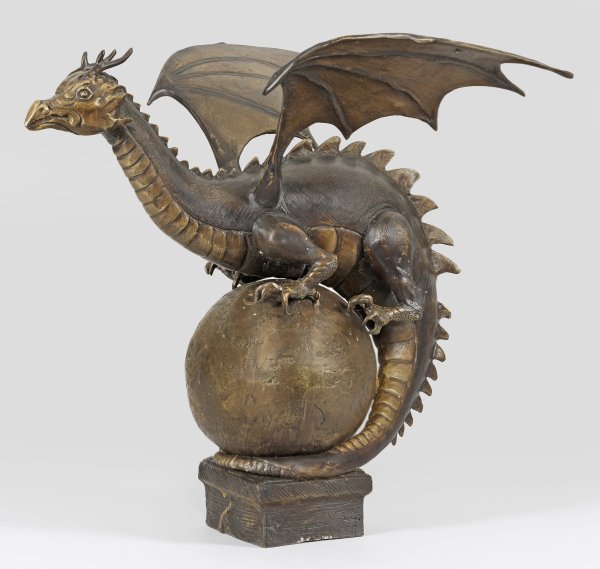 Bronze, dunkel und goldfarben patiniert. Über rechteckiger Basis auf eine stilisierte Weltkugel sich krallender, die Flügel weit aufgespannter, vollplastischer Drache. H. 54 cm. Flügelspannweite 50 cm.