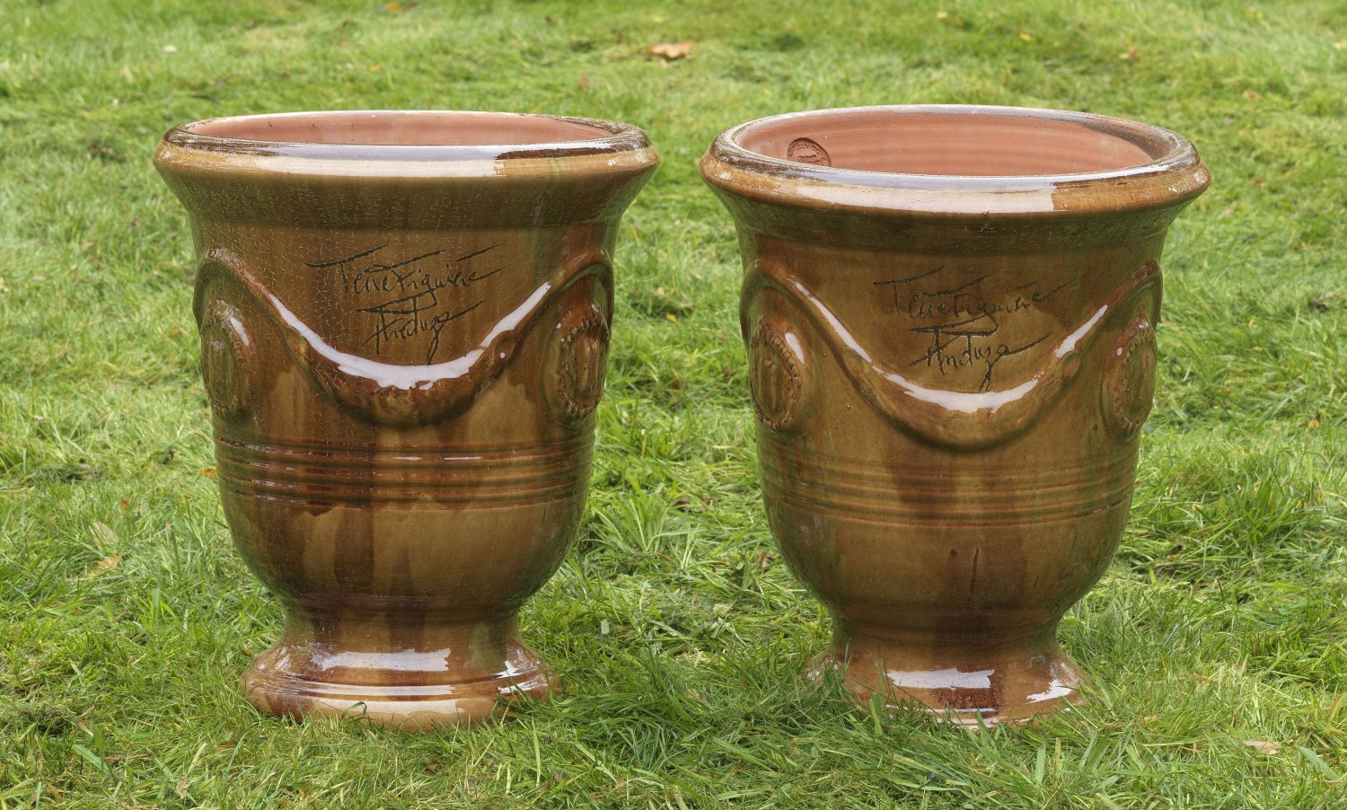 A pair of French brown and partly green glazed terracotta planters.