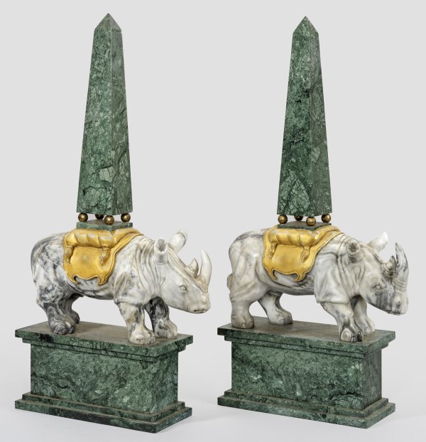 Gegenstücke. Weißer, hellgrau bzw. in unterschiedlichen Grüntönen gemaserter Marmor, teilw. goldfarben gefasst. Über querrechteckig angelegtem Sockel mit gestuft ansteigender Basis vollplastisch gestaltete Darstellung eines Nashorns als Träger für hohen, konisch verlaufenden Obelisken auf Kugelelementen nach einer Idee des französischen Bildhauers Jean Goujons (1510-1567) H. 80 cm.