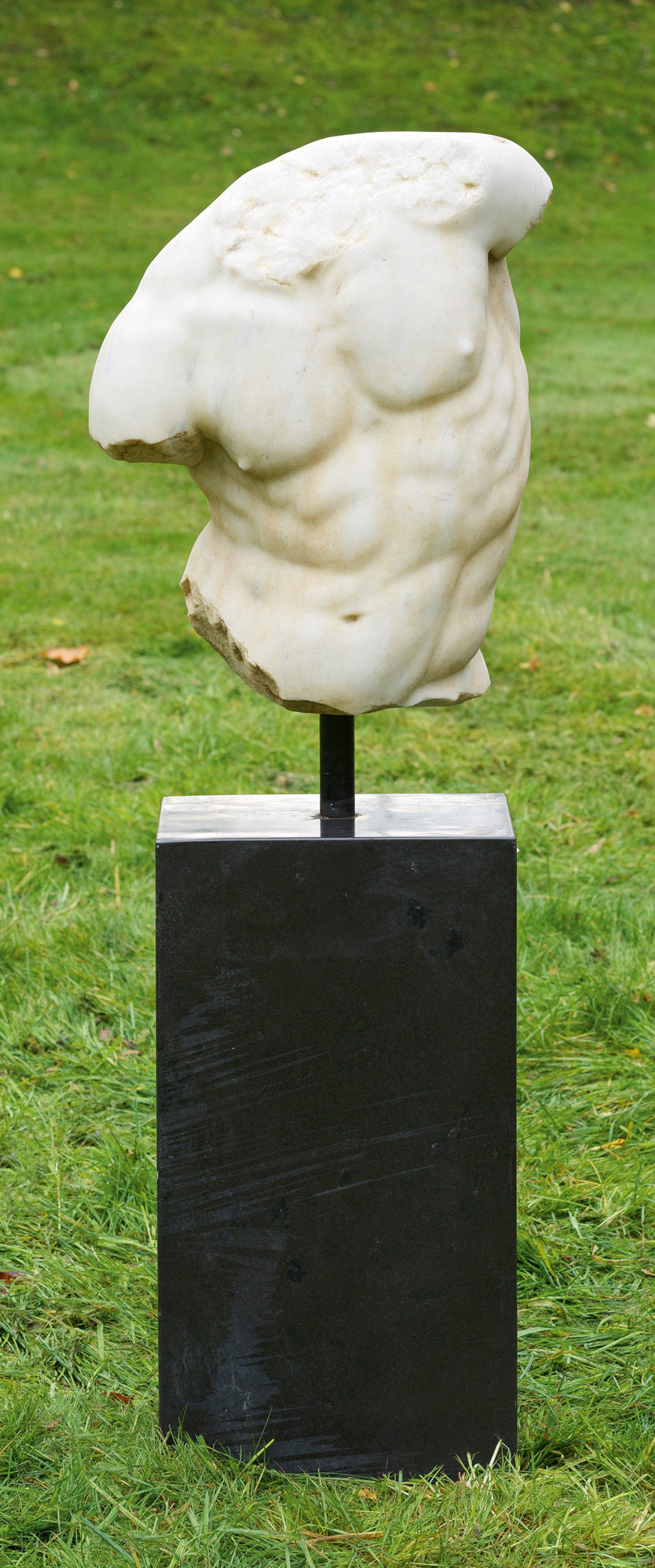 Weißer Marmor, der Sockel aus dunkelgrauem Marmor. Nach einem antiken, griechischen Vorbild gestaltete, vollplastisch gearbeitete Darstellung eines zur Seite geneigten, männlichen Torsos. Torso-H. ca.40 cm, Ges.-H. ca. 95 cm.