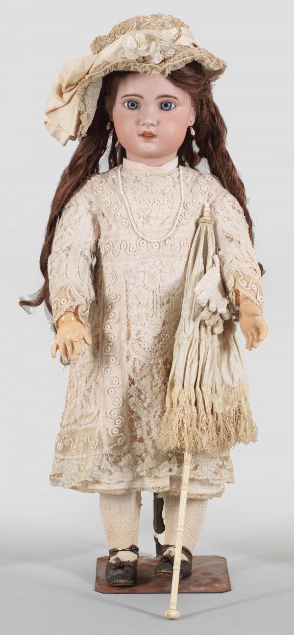 Übergroßes französisches "Bébé 1907" wohl von Jumeau Biskuitporzellan-Kurbelkopf mit durchstochenen Ohren und Ohrringen, geöffnetem Mund, blauen, fest eingesetzten sog. Paperweightaugen und langer dunkelbrauner Perücke mit Korkdeckel auf Gliederkörper aus Holz und Masse. Aufwändig bekleidet mit Jumeau-Lederschuhen, bez. Paris (Biene) Déposé. Im Nacken gem. 1907 15. Körper ungem.; Bespielt. Kleiner Chip am Ohrloch. Wangen minim. ber.; H. 80 cm. Dazu ein Puppenschirm.