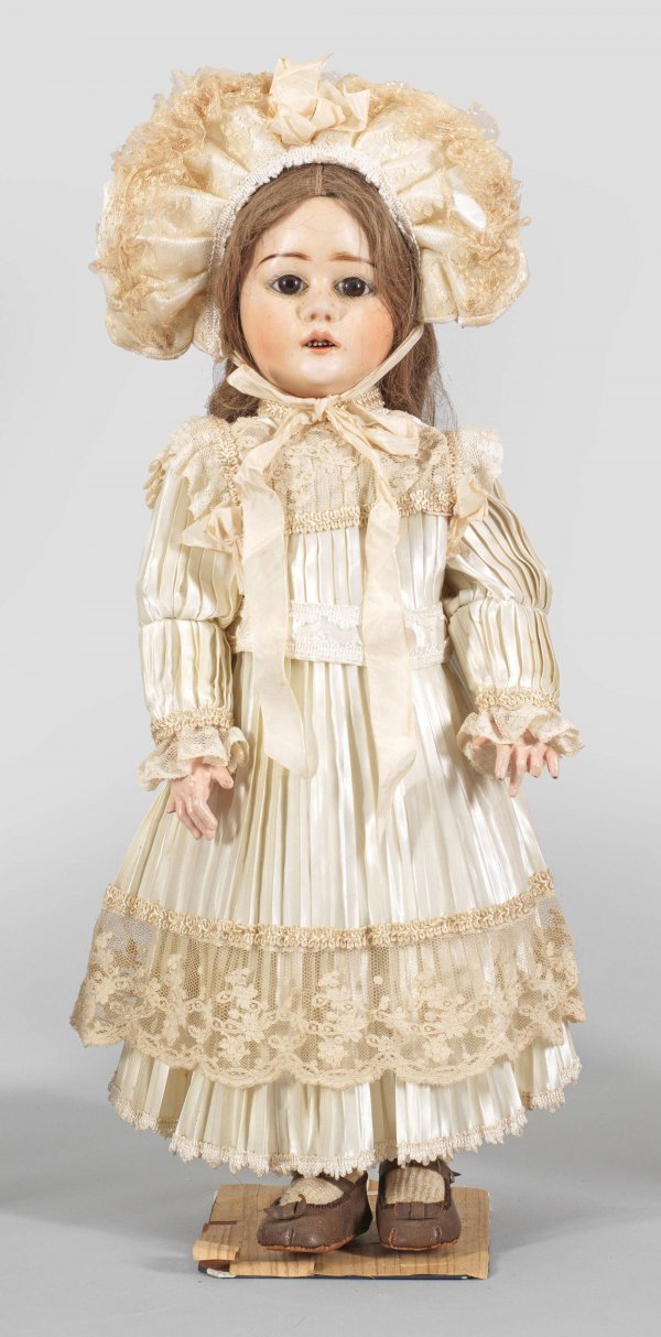 Große Gliederpuppe Bemalter Masse-Kurbelkopf mit geöffnetem Mund, braunen fest eingesetzten Augen und langer dunkelblonder Echthaarperücke auf Gliederkörper aus Holz und Masse. Aufwändig bekleidet. Hinterkopf mit rotem Stempel 9. Bespielt. Riss am Hinterkopf. Körper teilw. überstrichen. H. 61 cm.