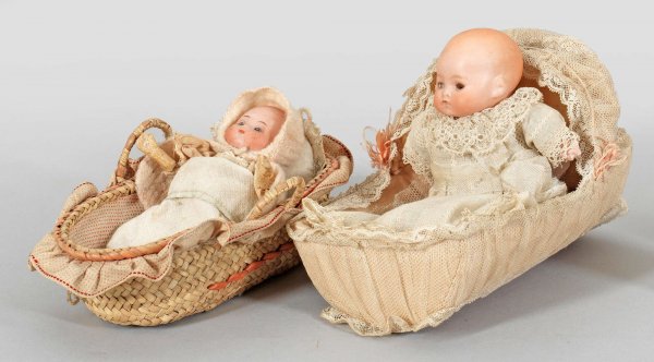 Zwei Miniatur-Babypuppen Biskuitporzellan-Vollkopf mit geschlossenem Mund und blauen Schlafaugen auf Stoffkörper mit Massehänden, einmal über einen Druckmechanismus am Bauch zu bewegen. Bekleidet. Im Nacken gem. Gemany 392 (...) bzw. AM Germany (...). Tüllbespannter Korb bzw. Wiege. Bespielt. 1x Haarriss und Augen eingefallen. Puppen-L. 14,5 - 17,5 cm.