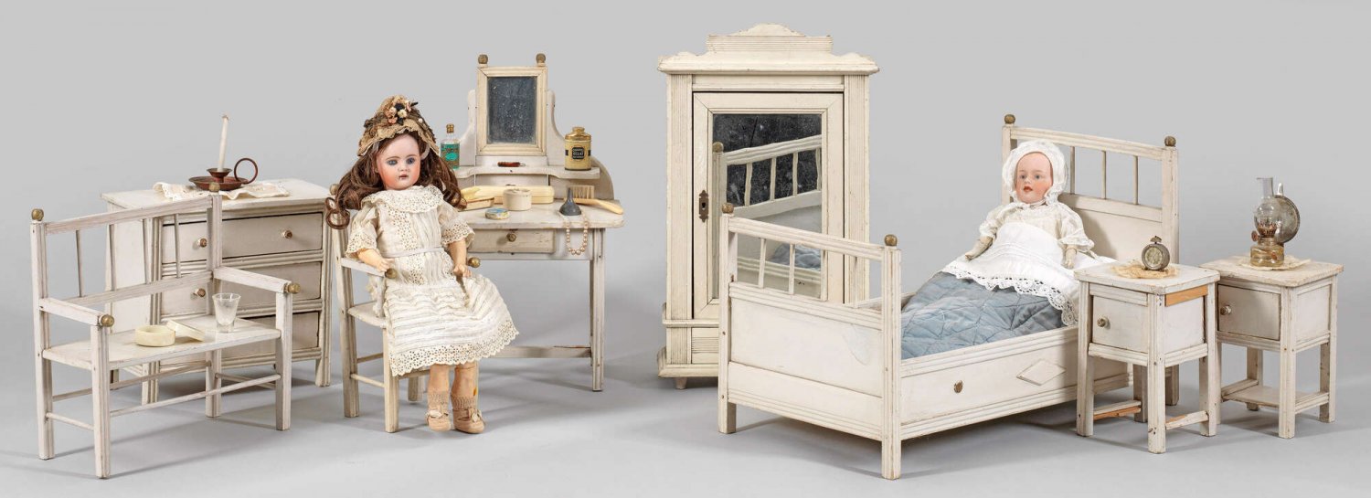 Puppenschlafzimmer mit zwei Puppen 8-tlg.; Bett, Kleiderschrank, Toilettetisch, Kommode, Paar Nachttische, Bank und Armlehnstuhl. Holz, weiß lackiert. Diverses Zubehör wie Wecker, Kerzenständer, Nachttopf, Bürsten, Kämme und Kosmetikartikel. Bett-H. 32,5 cm. 51 cm x 27,5 cm; Charakterbaby von Heubach mit Biskuitporzellan-Brustkopf, offen-geschlossenem Mund und sog. Intaglio-Augen, gem. 2 Germany. H. 35 cm sowie besch. Gliederpuppe mit Kurbelkopf, gem. 261 dep. H. 36 cm. Bespielt.