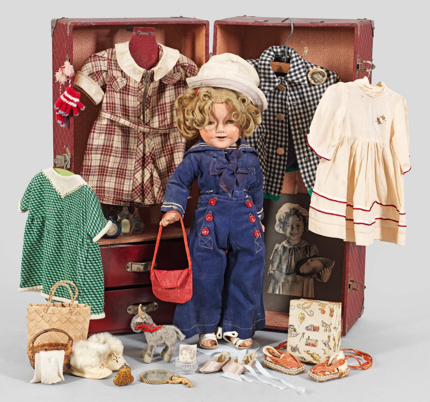Shirley Temple-Puppe von Ideal mit Reisekoffer Compositions-Kurbelkopf mit geöffnetem Mund, Schlafaugen und blonder Lockenperücke auf entsprechendem Gliederkörper. Im Nacken gem. Shirley Temple sowie Herstellerzeichen von IDEAL. Rücken gem. Shirley Temple 18. Bekleidet. Dazu rotbespannter Überseekoffer mit mehreren Kleidungsstücken, Schuhen, Lockenbrennschere, Accessoires sowie Postkarten und Zeitungsausschnitten zu Shirley Temple. Bespielt. Krakelé. Puppen-H. 45 cm.