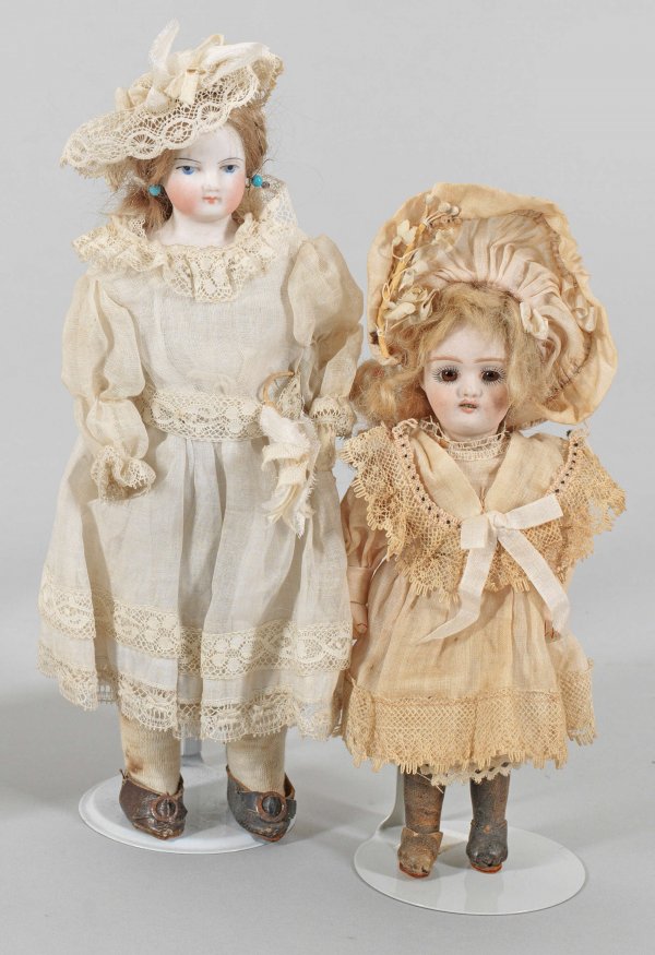 Zwei kleine Gliederpuppen Biskuitporzellan-Kurbelkopf mit geöffnetem Mund, fest eingesetzten braunen Augen und Mohairhaaren auf Gliederkörpern aus Masse. Alt bekleidet; Biskuitporzellan-Brustkopf mit geschlossener Kopfkrone, gemalten Zügen sowie durchstochenen Ohren auf teilw. rep. Gliederkörper aus Stoff und Leder. Ungem.; Bespielt. H. 19-25,5 cm.