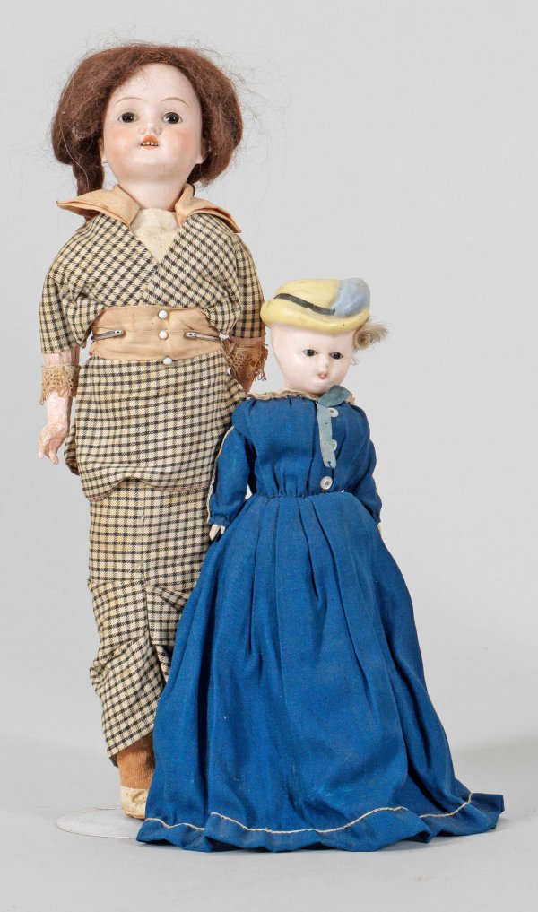 sog. Pumpkin-Head Doll. Wachsüberzogener Papiermaché-Brustkopf mit modelliertem Hut, geschlossenem Mund und fest eingesetzten Glasaugen auf Stoffkörper mit Armen und Unterschenkeln aus Holz. Unbez.; Biskuitporzellan-Kurbelkopf auf Balgkörper mit Armen und Beinen aus Masse, teilw. fest alt bekleidet. Im Nacken gem.: S PB(im Stern) H 1909 3/0 Germany. Bespielt. H. 30 - 41 cm.