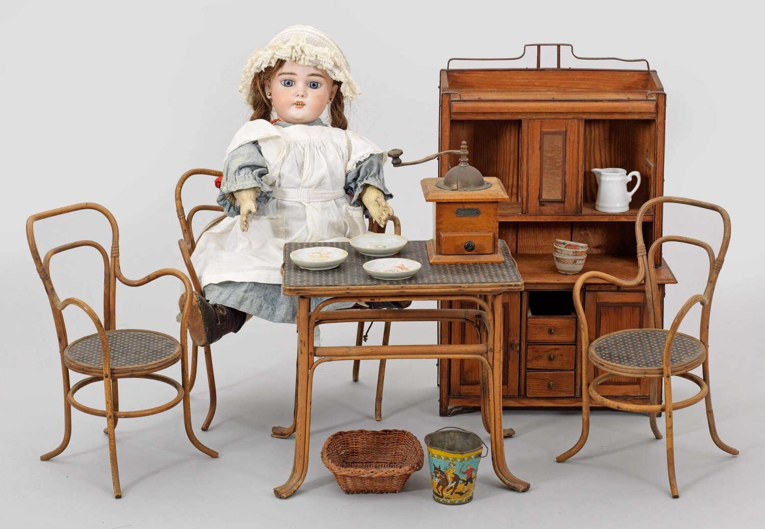 Biskuitporzellan-Kurbelkopf mit durchstochenen Ohren, geöffnetem Mund, fest eingesetzten blauen Augen und brauner Echthaarperücke auf Gliederkörper aus Holz und Masse. Bekleidet mit Lederschuhen. Gem. SH 1079-10 DEP sowie am Körper Reste eines blauen Klebeetiketts von A. Gesland. Perückenpull, Chips an den Ohrlöchern, Haarriss am Hinterkopf. Dazu besch. Puppenküchenschrank, Garnitur Rohrmöbel, Kaffeemühle, Blecheimer sowie drei kleine Koppchen. Puppen-H. 48 cm.