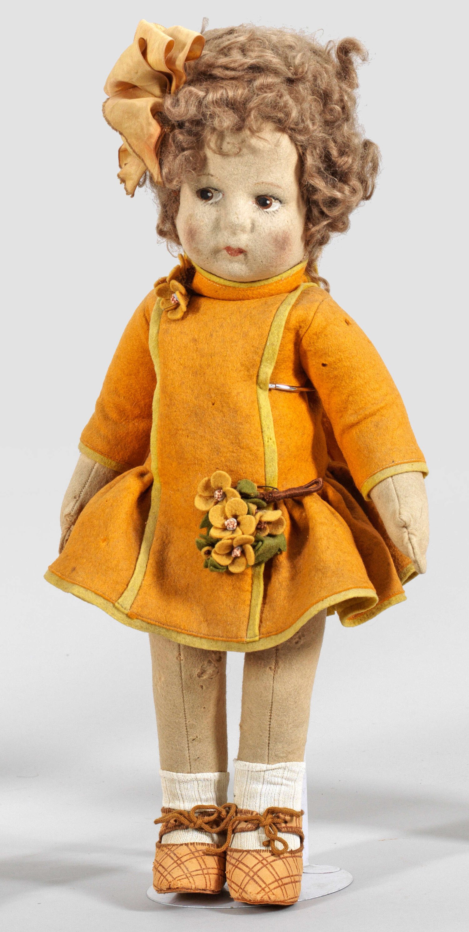Charakter-Filzpuppe sog. Lenci-Typ. Filzbezogener Charakterkopf mit seitlich blickenden Augen und Mohairhaaren auf weichem Gliederkörper aus Filz. Originalkleidung. Unbez.; Bespielt. teilw. besch.; H. 45 cm.