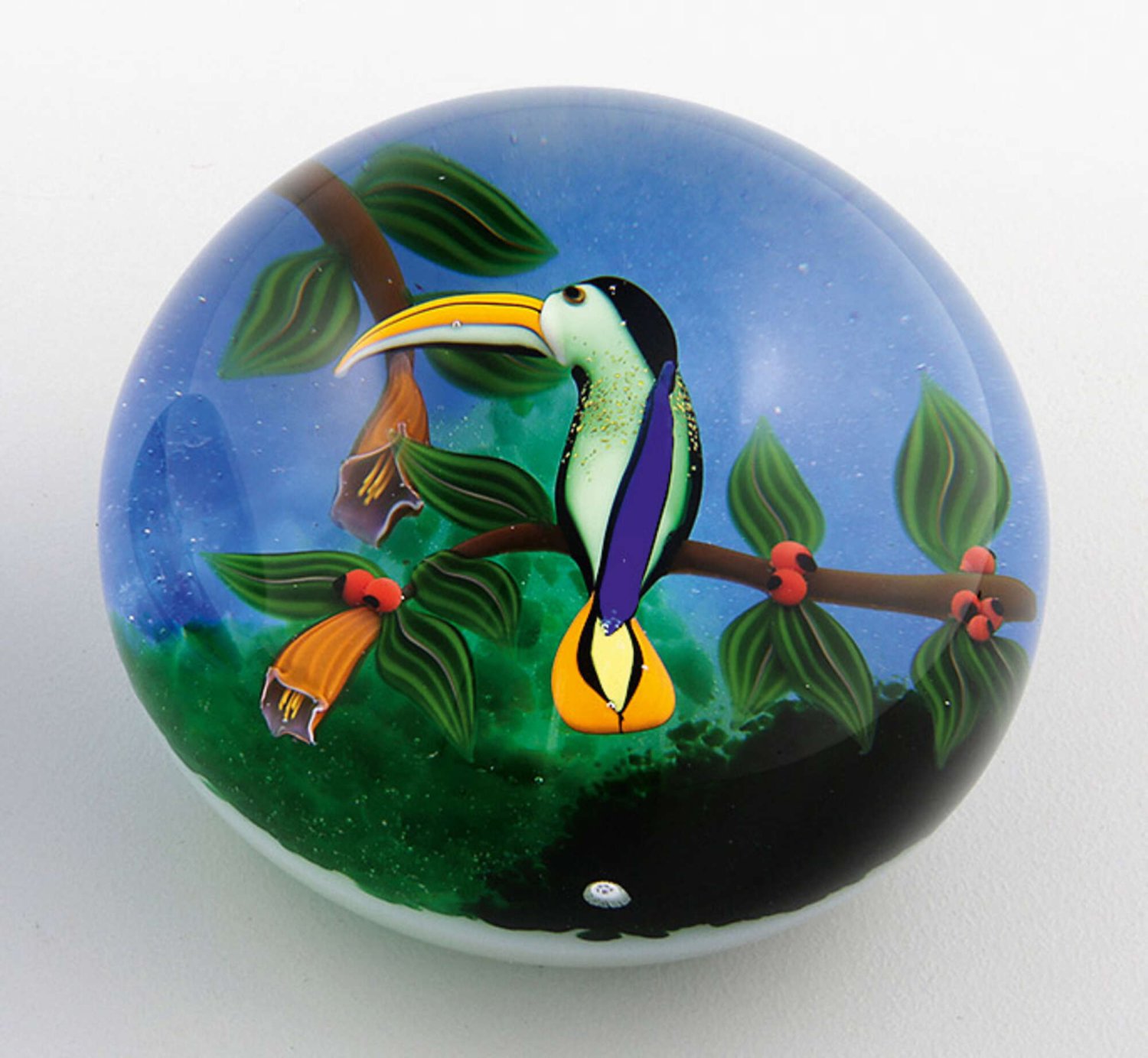 Paperweight mit Tukan von Baccarat aus limitierter Edition. Farbloses und milchig weißes Glas. Halbrund. Auf blauem und grünem Grund die plastische Darstellung eines farbenfrohen Tukans auf einem Zweig mit roten Beeren und exotisch blühender Blüten. Limitierte Auflage 42/100. Herstellerzeichen mit Dat.; Zertifikat. H. 6 cm. D. 8,5 cm.