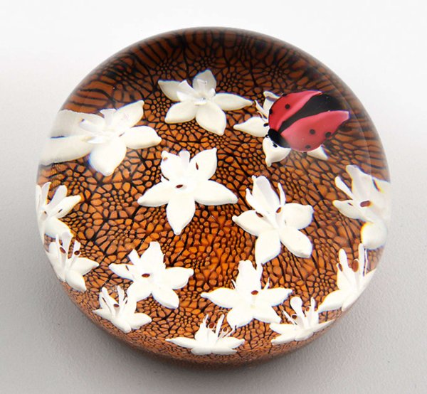A French glass paperweight with a red ladybug hovering above white blossoms. Limited edition of 150. Signature cane. Dated. Certificate.