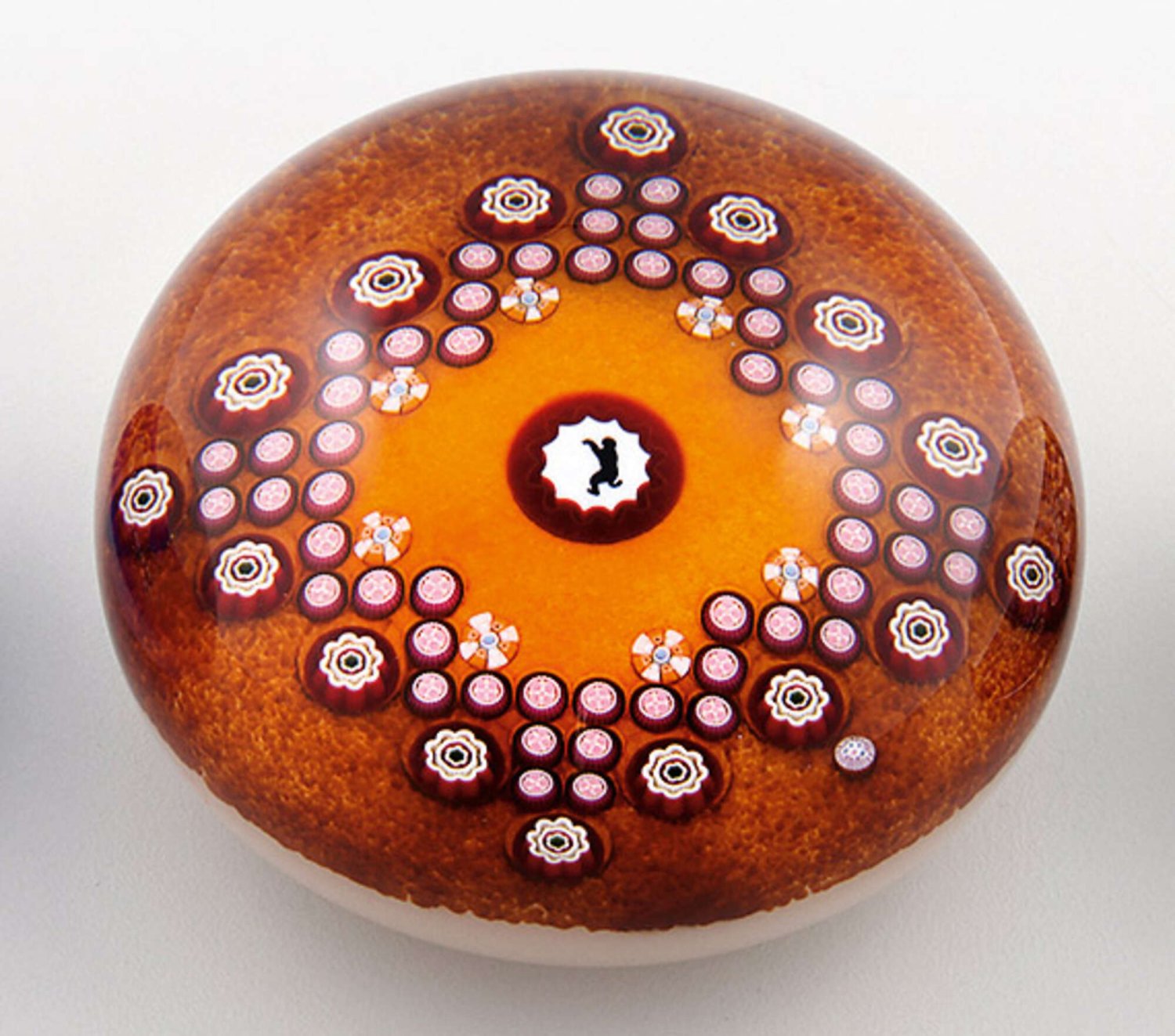 Paperweight mit Affe und Millefiori von Baccarat aus limitierter Edition. Farbloses und milchig weißes Glas. Kugelig. Zentrales Medaillon mit Silhouette eines Affen, umgeben von rautenförmig angeordneten kleinen und großen rosa- und rotfarbenen Millefiori-Canes auf meliert ockerfarbenem Grund. Limitierte Auflage 19/75. Herstellerzeichen mit Dat.; Zertifikat. H. 6,5 cm. D. 10,5 cm.