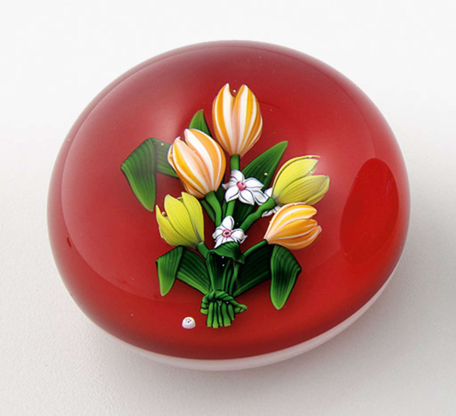 A French glass paperweight with a bouquet of tulips and narcissus. Limited edition of 100. Signature cane. Dated. Maker's mark. Certificate.
