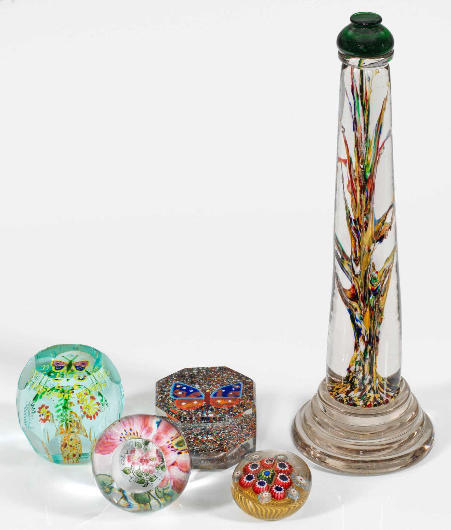 Kleine Kollektion von fünf floralen Paperweights Farbloses Glas, teilw. facettiert geschliffen. Polychrome, florale Ziereinschlüsse u. a. in Krösel-Technik oder mit Millefiori-Dekor. Teilw. mit Emailmalerei. Großer Stalagmit-Paperweight. Minim. altersbedingte Gebrauchsspuren. H. 3,5 cm - 32 cm.
