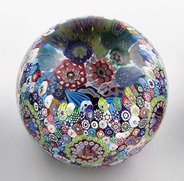 Paperweight "Un vent de paradis" von Saint-Louis aus limitierter Edition. Farbloses Glas. Kugelig. Wandung mit Fond aus eingeschmolzenen, dicht angeordneten, polychromen Millefiori-Canes mit ovalen Aussparungen. Zentral schwebender Schmetterling in Weiß und Blau. Limitierte Auflage 73/75. Herstellerzeichen mit Dat.; Zertifikat. H. 7,5 cm. D. 8 cm.