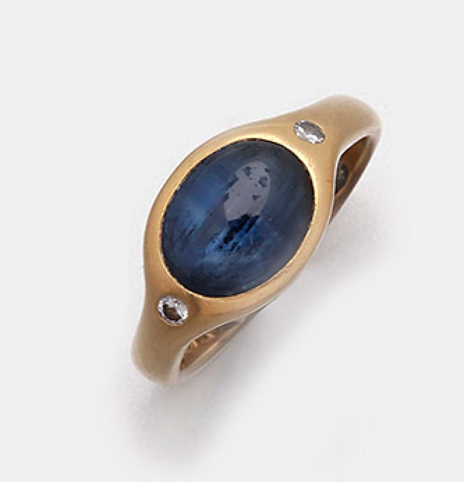 Moderner Saphir-Bandring Gelbgold, gest. 750. Zentral besetzt mit einem tintenblauen Saphircabochon, flankiert von zwei Brillanten von zus. ca. 0,05 ct. (F-G/vs). Sehr feine Goldschmiedeausführung. Gew. 6,06 g.