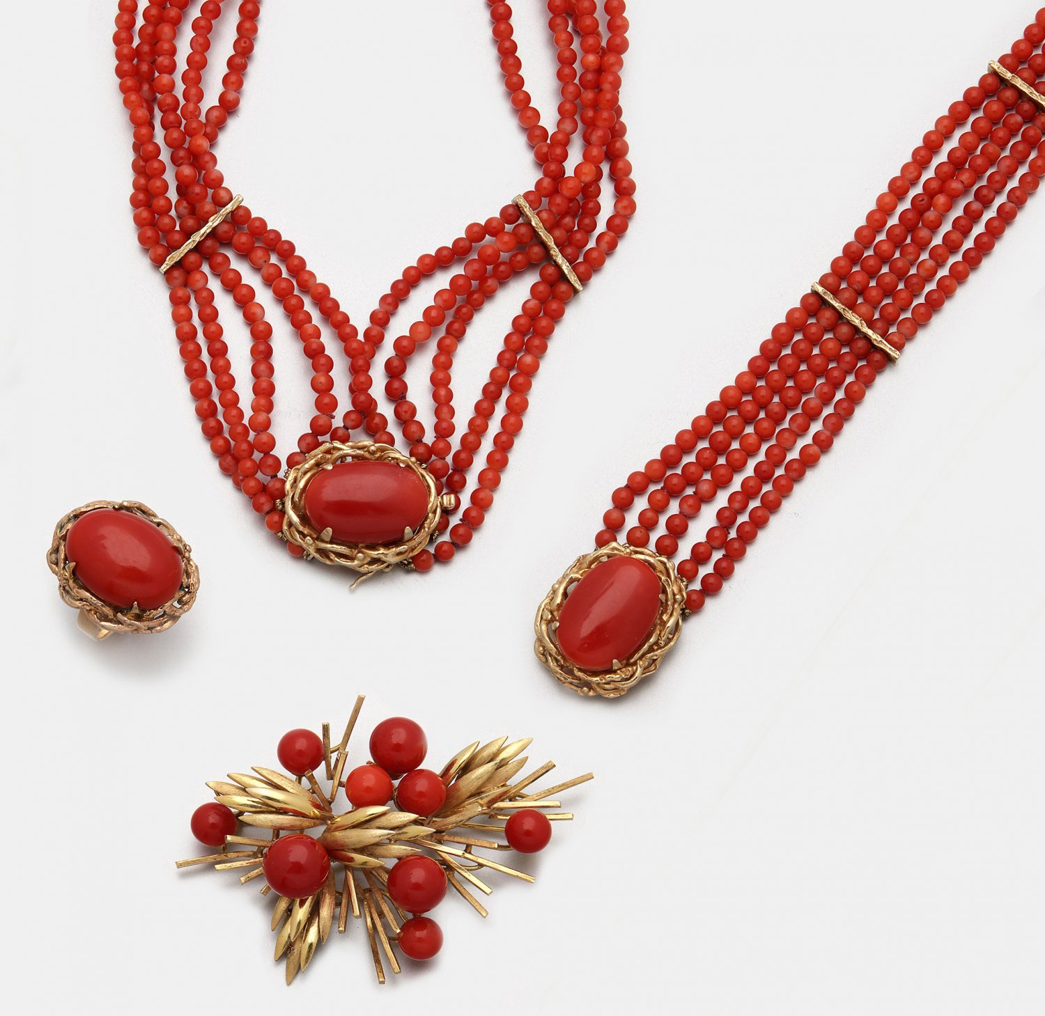 Sardegna Korallen-Parure aus den 60er Jahren Gelbgold, gest. 14 ct. und 750. Fünfreihiges Collier de Chien aus roten Korallenperlen, zentrale Schließe mit einem Korallencabochon besetzt, korrespondierendes Armband, Ring und Brosche. Ges.-Gew. ca. 103,11 g.