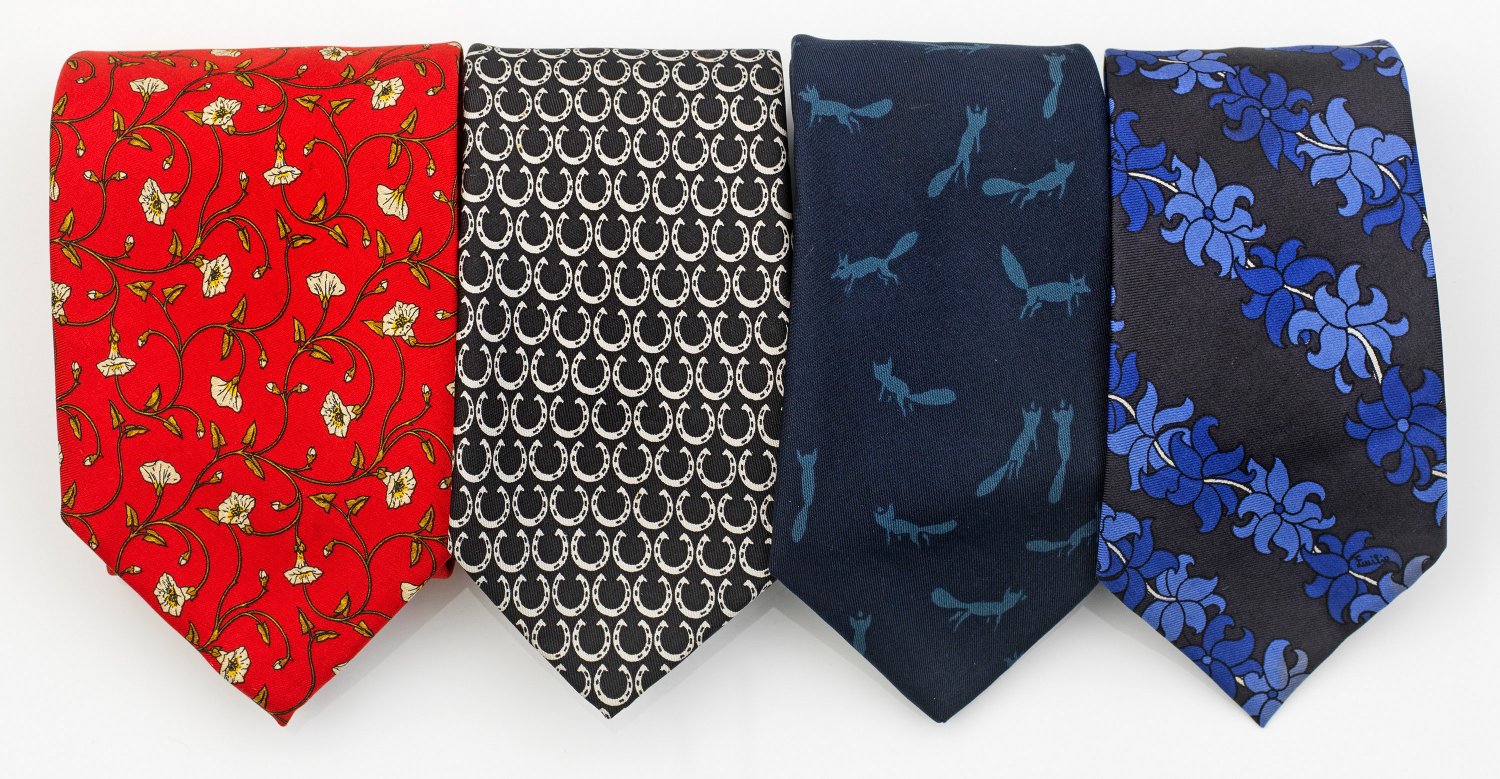 Vier Vintage Seidenkrawatten Modell 378 EA sowie 258 MA. Seide. Flächendeckende Musterung aus hellblauen Füchsen auf blauem, weißen Hufeisen bzw. blauen Blütenreihen auf schwarzem und Arabesken auf rotem Fond. Herstellerzeichen. Gebrauchsspuren.