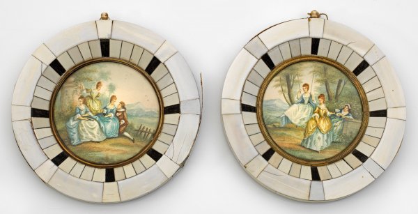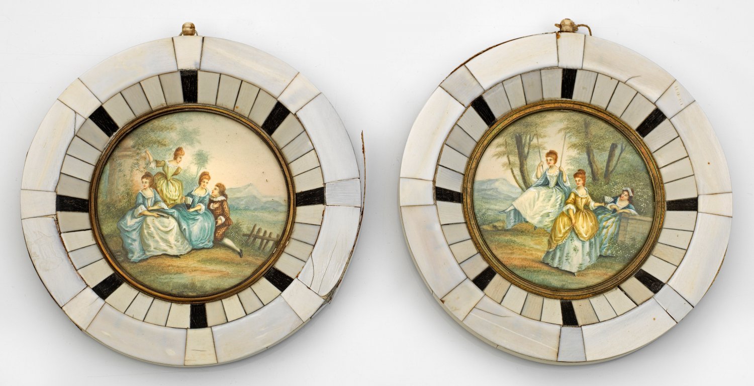 Paar Miniaturen mit Watteauszenerien Gegenstücke. Zwei sehr fein und detailreich gemalte, runde Miniaturbildnisse mit galanten Watteauszenerien. Vor weitem Landschaftshintergrund mit Bergen unter anderem drei Damen in höfischen Gewändern des Rokoko, umworben von knieendem Kavalier.Tempera auf Elfenbein. Rahmen belegt mit Elfenbein- und ebonisierten Elfenbeinelementen. Messingblenden. Elfenbeinelemente teilweise ersetzt. D. 10 cm.