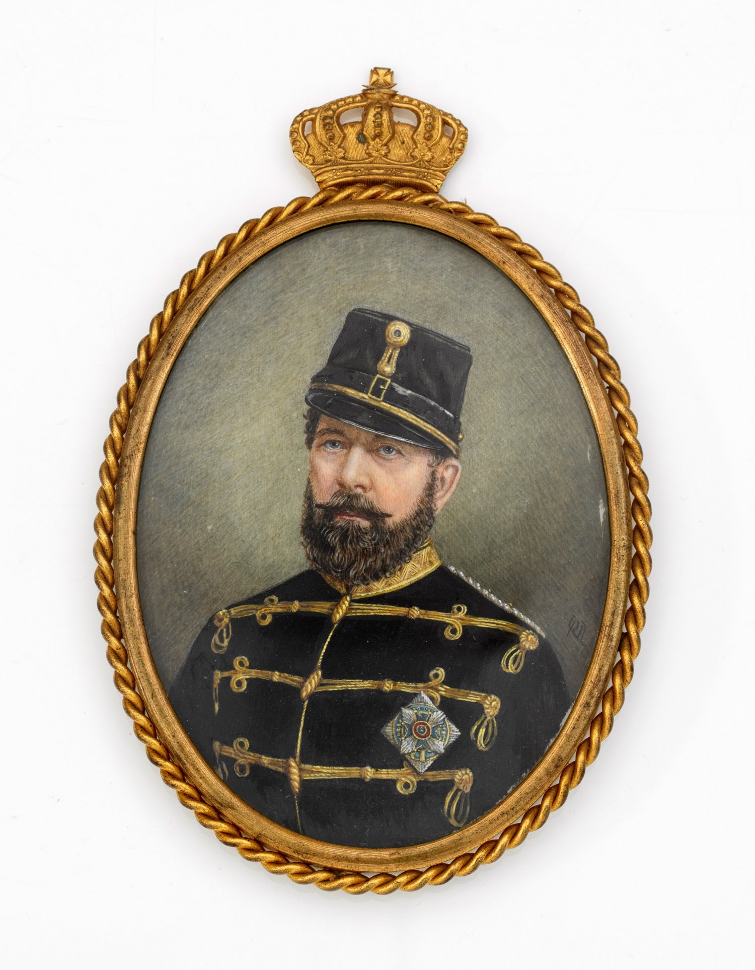 Herzog Wilhelm zu Braunschweig und Lüneburg Ovales Brustbildnis des Herzogs von Braunschweig, bekleidet in der Uniform des herzoglich-braunschweigischen Husarenregiments mit Bruststern des Ernst-August-Ordens. Hellgrauer Hintergrund. Gouache auf Elfenbein. Vergoldeter Messingrahmen mit Herzogskrone bekrönt. M. r. sign. EB. Rückseitig bez. ; 12 cm x 9 cm.