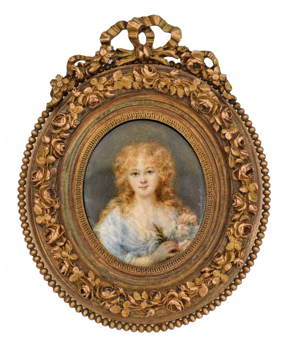 Porträt eines jungen Mädchens Brustbildnis eines jungen Mädchens mit rötlichen, lockigen Haaren, verträumt an einem Blumenbukett zupfend. Gesicht frontal. Bekleidet mit zart hellblauem Kleid und weißem, leicht durchsichtigem Seidentuch über den Schultern. R.m. bez. M. d' Aumont (?). Tempera auf Elfenbein. Schwerer Bronzerahmen mit Schleife und Rosen verziert. 6 cm x 5 cm.