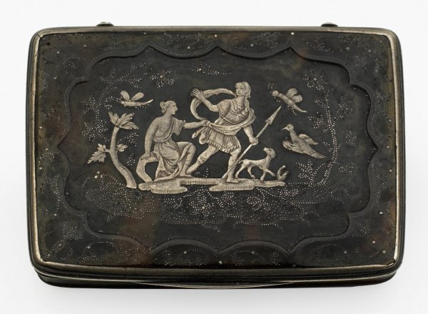 Seltene Schildpatt-Tabatiere mit Silbermontierung. Flache, rechteckige Form aus Schildpatt. Auf der Oberseite fein gravierte, mythologische Szenerie aus Silbereinlagen und Silberpiqué. In einer baumbestandenen Landschaft, Darstellung einer Abschiedsszene zwischen einer Frau und einem bewaffneten, davoneilenden Mann mit Hund. Umgeben von großen Insekten und Vögeln. Auf der Rückseite zierendes Silberpiqué-Bandelwerk. H. 1,5 cm. 8 cm x 5,5 cm.