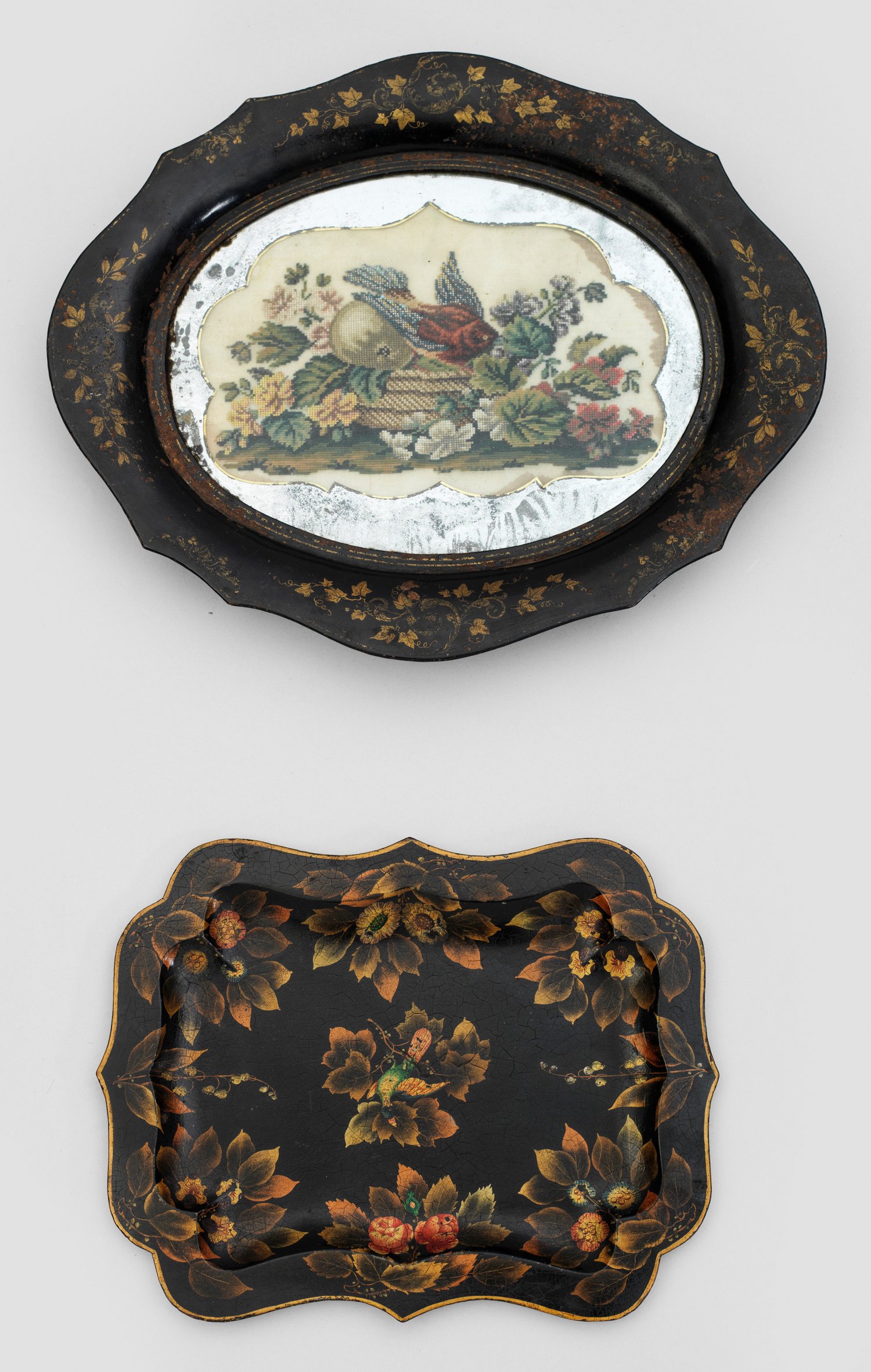 Zwei viktorianische Ziertabletts Weißblech, schwarz lackiert. Im vertieften Spiegel mittig ein Paradiesvogel umgeben von Blüten und Blättern in lüsierenden Farben bzw. Stickerei eines Vogels auf Früchtekorb hinter teilw. verspiegeltem Glas. Z. T. polychrome Öl-Lackmalerei. Altersgemäße Gebrauchsspuren. 44,5 cm x 38 cm.