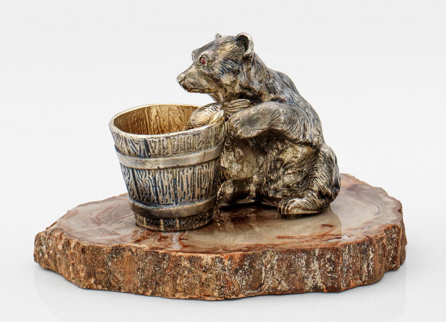Bär Silber, teilw. vergoldet und Holzstein, poliert. Naturalistische Wiedergabe eines jungen Bären, aus dem vor ihm stehenden Bottich einen Fisch mit der Pfote angelnd. Dekorativer Sockel aus Holzstein. Gest. Kokoschnik 88. Meistermarke. Brutto-Gewicht ca. 230 g.. H. 4,5 cm.