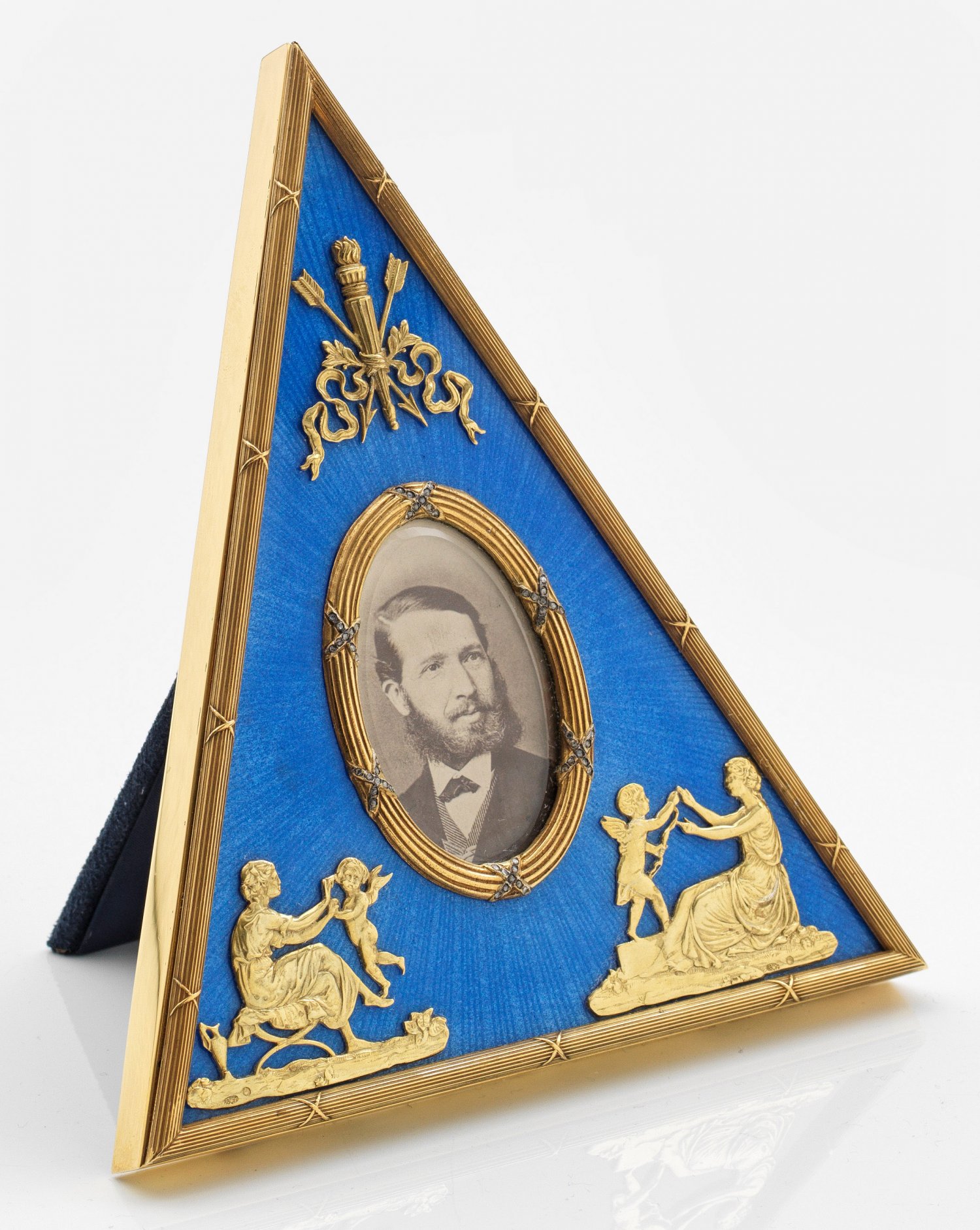 Bilderrahmen im Stil von Karl Fabergé. Silber, vergoldet und teilw. emailliert. Dreieckiger Rahmen aus vergoldetem Silber. Auf flächendeckend hellblau emailliertem und strahlenförmig gouillochiertem Grund, reliefplastische Darstellungen von zwei Frauen der Antike, mit Putten spielend. Ovaler mit Kreuzbanddekor und Diamantrosen versehener Bildausschnitt. Bekrönt von Schleifenornament, Pfeilen und brennender Fackel. Rückseitig aufstellbar. Gest. Kokoschnik 88. 18 cm x 16 cm. Bildausschnitt 6 cm x 4 cm.