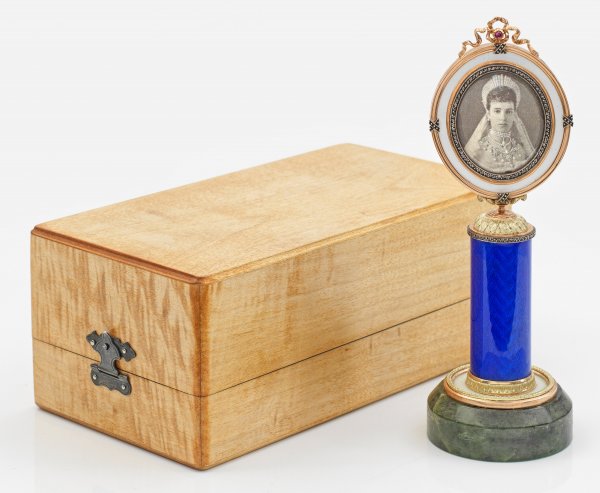 Kleiner Bilderrahmen im Stil von Karl Fabergé. Mit Holz-Schatulle. Nephrit und Kupfer, teilw. vergoldet und emailliert. Hoher, getreppter Nephrit-Sockel. Darauf dunkelblau emailliert und wellenförmig gouilliochierte Säule mit teilw. vergoldeter Kupfermontierung im Blätterfries-Dekor. Ovaler, mit Kreuzbanddekor und Diamantrosen versehener Rahmen. Bekrönt von Schleife mit Farbsteincabochon. Gest. 56. H. 17 cm. Bildausschnitt 4 cm x 3,5 cm.