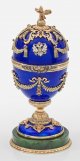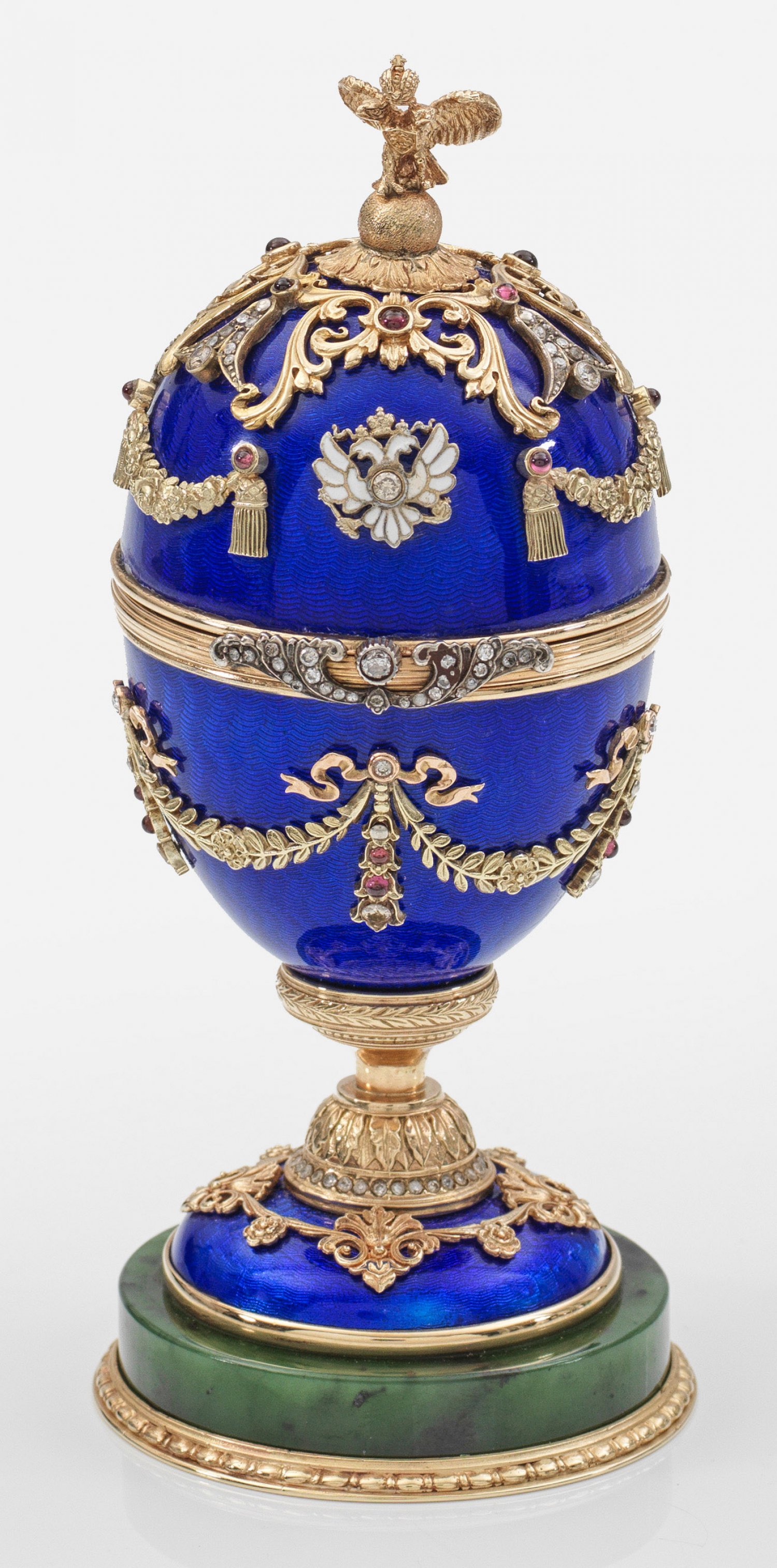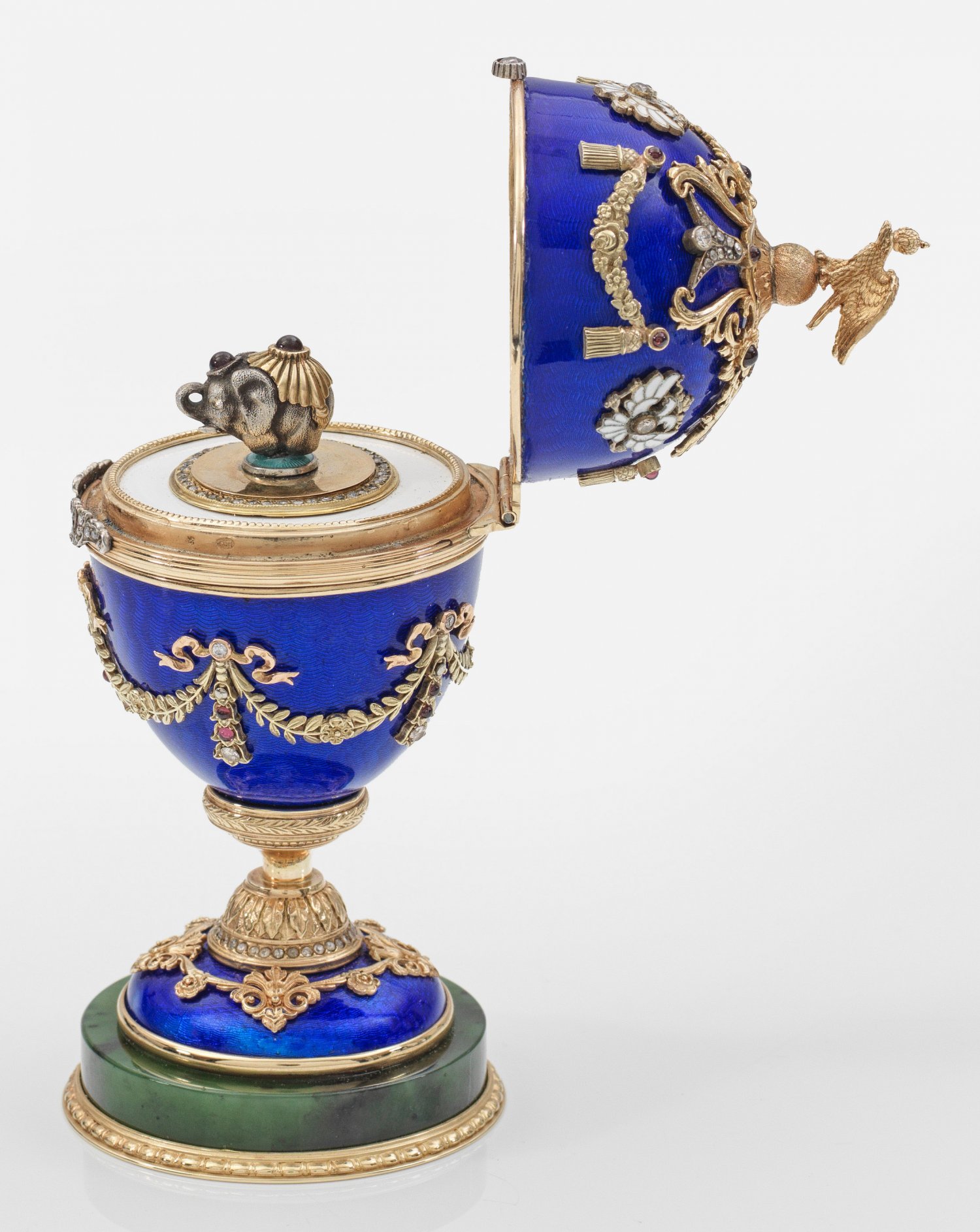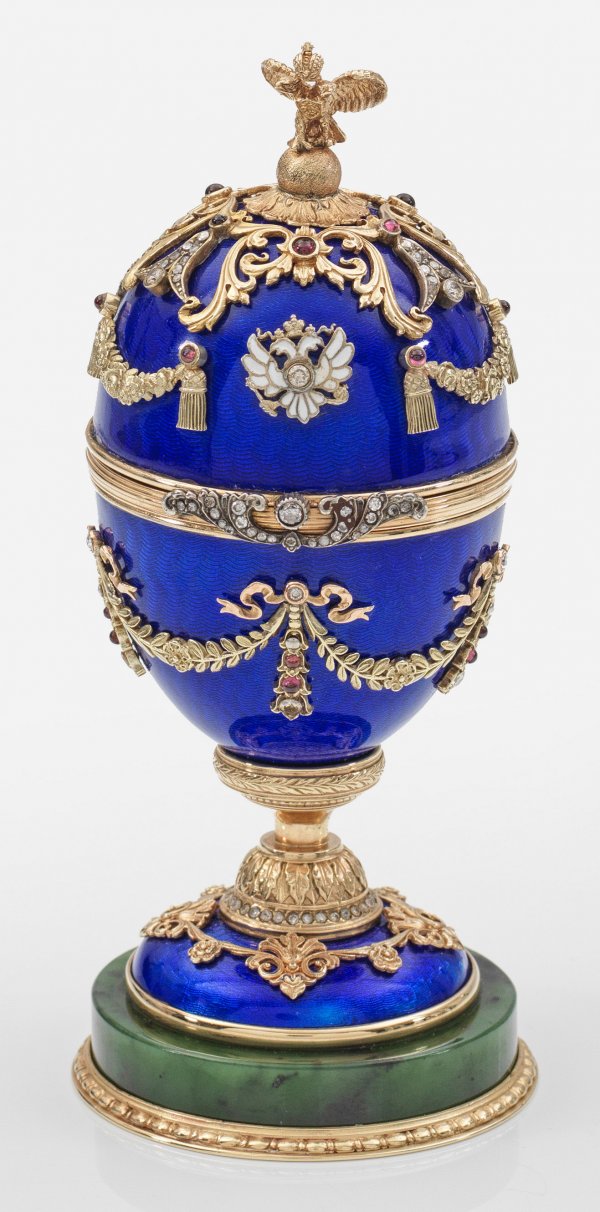 Prunk-Ei im Stil von Karl Fabergé. Mit Etui. Silber, teilw. vergoldet bzw. emailliert. Auf rundem Sockel aus Nephrite Schaft mit reliefplastischem Blätterfries und Diamantrosen. Ovoider, mittig scharnierter, blau emaillierter und guillochierter Korpus. Reiche, florale und figurale Applikationen, teilw. besetzt mit Granatcabochons und Diamantrosen. Als Knauf vollplastischer Doppeladler. Innen eine naturalistisch gearbeitete Elefanten-Miniatur, aus teilw. emailliertem und vergoldetem Silber, geschmückt mit Farbsteincabochons. Gest. 56. H. 14 cm.