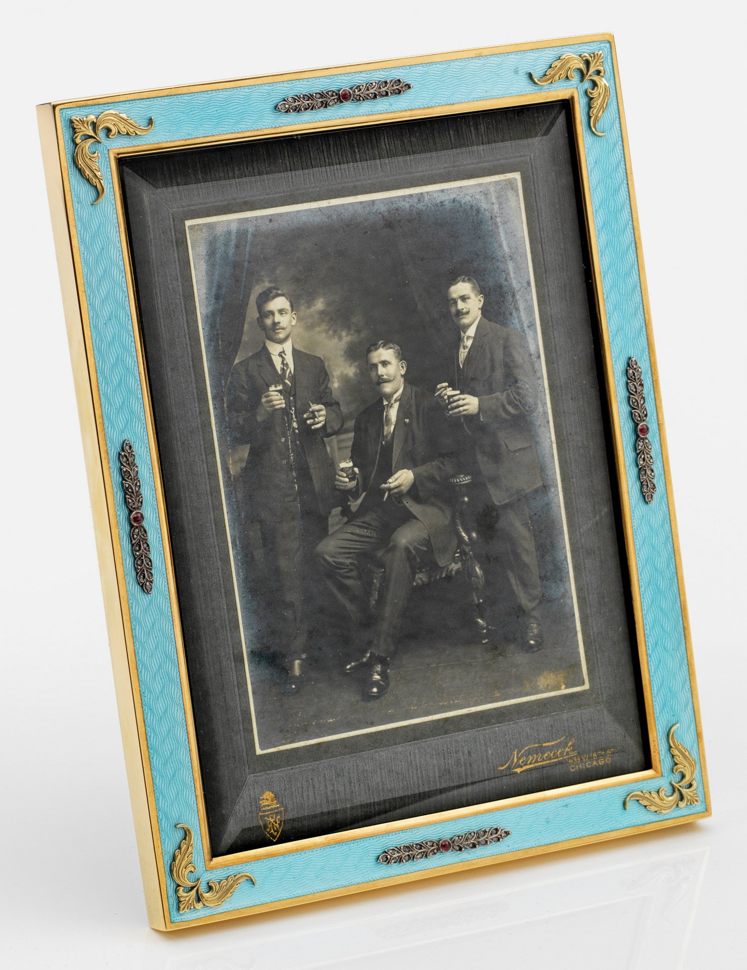 Großer Tisch-Bilderrahmen im Stil von Karl Fabergé. Silber, vergoldet und teilw. emailliert. Rechteckige Form. Guillochiert und hellblau emailliert. Mit applizierten, stilisierten Blüten und Blattzweigen, besetzt mit Diamantrosen und Rubincabochons. Rückseitig aufstellbar. Gest. Kokoschnik 88; AH. 21 cm x 16 cm. Bildausschnitt 18 cm x 13 cm.
