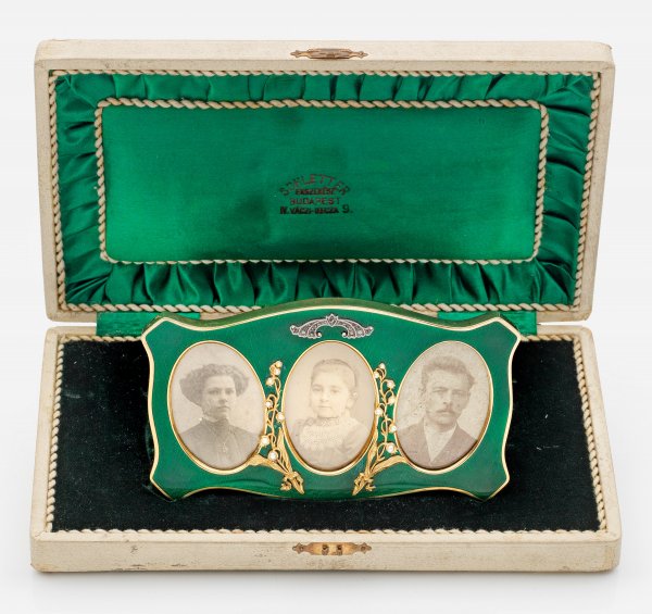 Tischbilderrahmen im Stil von Karl Fabergé. Mit Box. Silber, vergoldet und teilw. emailliert. Rechteckige, passig geschweifte Rahmung mit drei ovalen Bildausschnitten. Schauseitig dunkelgrün emailliert sowie applizierte, mit kleinen Perlen besetzte Maiglöckchenstängel. Rückseitig aufstellbar. Gest. 88, AH. H. 9 cm x 15 cm. Bildausschnitt 6 cm x 4 cm.