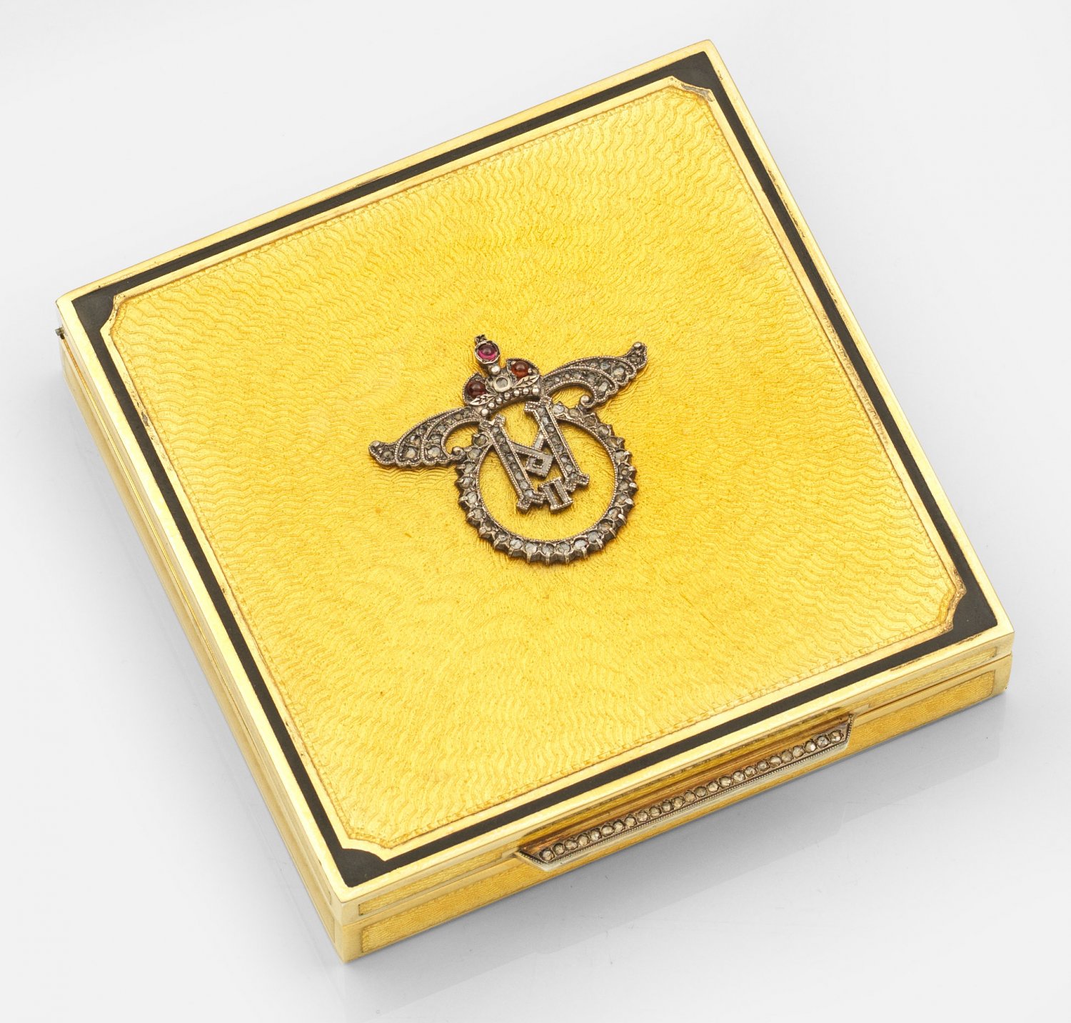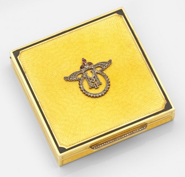 Große Emaildose im Stil von Karl Fabergé. Silber, vergoldet, teilw. emailliert. Quadratische Form. Der Deckel von schwarzer Emaille gerahmt, guillochiert und gelb emailliert. Mittig bekröntes Monogramm aus Silber in Zierschrift, besetzt mit drei Granatcabochons und Diamantrosen. Linearer Drücker ebenfalls mit Diamantrosen besetzt. Gest. Kokoschnik 88; AH. Gew. ca. 380 g. 10 cm x 10 cm.