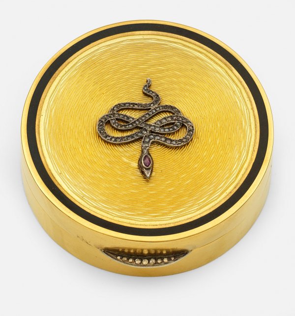 Runde Emaildose im Stil von Karl Fabergé. Silber, vergoldet, teilw. emailliert. Runde Form. Der Deckel von schwarzer Email gerahmt, guillochiert und gelb emailliert. Mittig applizierte Schlange aus Silber, besetzt mit einem Granatcabochon und Diamantrosen. Drücker ebenfalls mit Diamantrosen besetzt. Gest. Kokoschnik 88; AH. Gew. ca. 135 g. D. 7,5 cm.
