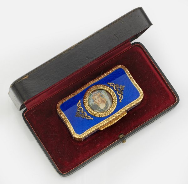 Email-Tabatiere im Stil von Karl Fabergé. Mit Etui. Silber, vergoldet und teilw. emailliert. Rechteckig mit gerader Wandung. Scharnierdeckel und Wandung blau emailliert über wellenbandförmig guillochiertem Grund, teilw. mit weißer Umrandung. Auf dem Deckel Brustbildnis einer blonden Frau mit Blüten im Haar. Gerahmt von Blütenfestons mit Diamantrosen besetzt. Gest. Kokoschnik 88. Miniatur sign.; H. 2,3 cm. 10 cm x 5 cm.