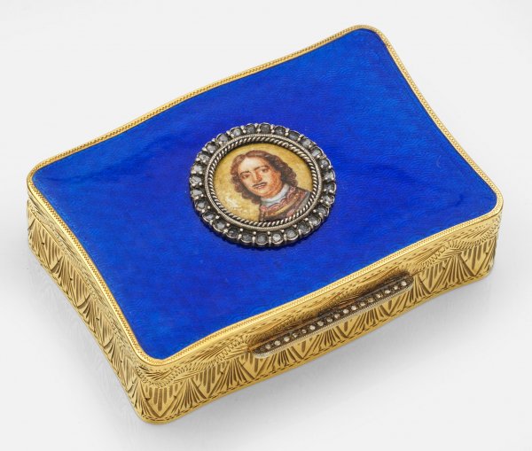Kleine Email-Tabatiere im Stil von Karl Fabergé. Silber, vergoldet und teilw. emailliert. Rechteckig mit gerader Wandung. Scharnierdeckel blau emailliert über wellenbandförmig guillochiertem Grund. Mittig ein Brustbildnis von Peter dem Großen, gerahmt von Diamantrosen. Linearer Drücker ebenfalls mit Diamantrosen besetzt. Unterseite und Wandung mit flächendeckendem Dekor aus Blatt- und Blütenranken sowie mit Blattfries gestaltet. Gest. Kokoschnik 88; EK. H. 1,5 cm. 7,5 cm x 5 cm.