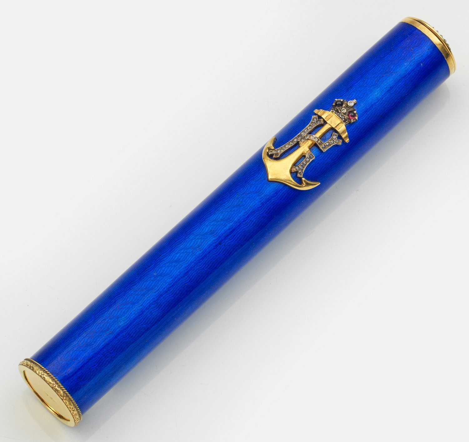 Zigarrenetui im Stil von Karl Fabergé. Silber, vergoldet. Zylindrisch. Umlaufend blau emailliert über fein guillochiertem Grund. Schauseitig aufgelegter, bekrönter Anker mit Monogramm "K", besetzt mit Rubincabochons und Diamantrosen. Auf flachem Scharnierdeckel reliefiertes Steuerrad. Gest. Kokoschnik 88. Gew. ca. 250 g. L. 18,5 cm.