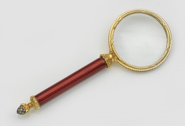 Lupe im Stil von Karl Fabergé. Silber vergoldet und teilw. emailliert. Ornamentierte Rahmung. Zylindrischer, blutrot emaillierter Griff über fein gouillochiertem Grund. Kannelierte Montierung. Knospenförmiger Abschluss besetzt mit Diamantrosetten. Gest. Kokoschnik 88. L. 15,5 cm.