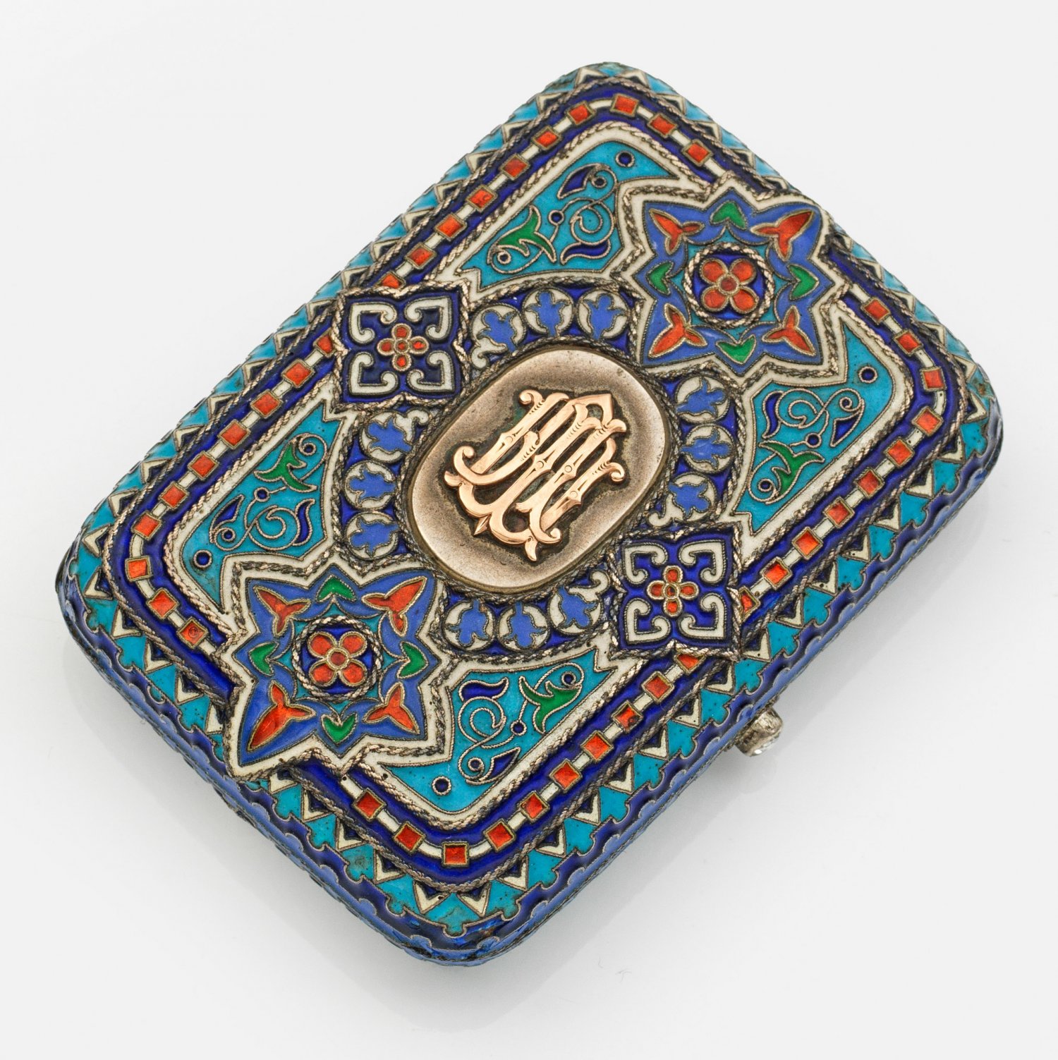 Russisches Cloisonné-Zigarettenetui Silber, vergoldet und emailliert. Rechteckige Form mit gerundeten Ecken und beidseitigem ornamentalem Dekor aus polychromen Zellenschmelzemail. Auf dem Deckel zentral eingefasstes Medaillon mit erhabenem Monogramm. Innen vergoldet und monogr.; Gest. 88. Beschaumarke, Meistermarke. Minim. best.; Brutto-Gew. ca. 180 g. H. 2 cm x 9,5 cm x 7 cm.